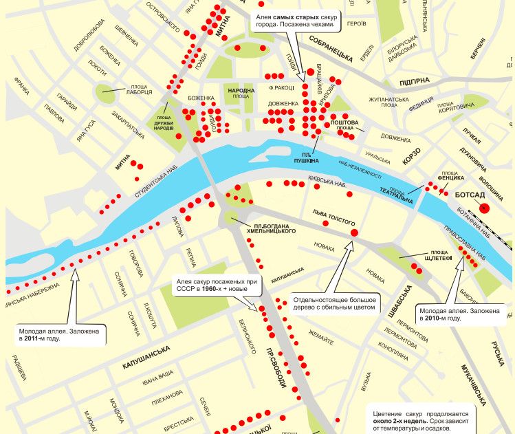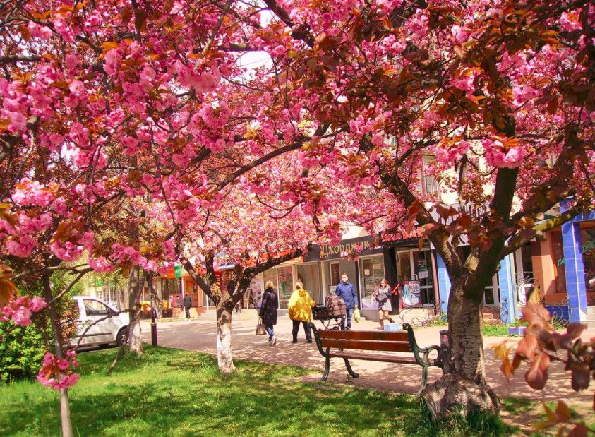 В Ужгороде есть удивительное место – это набережные реки Уж. Вдоль её берегов тянется необыкновенной красоты аллея из лип и сакур. Это одна из самых длинных аллей Европы, её протяжённость - 2,2 км. Высаженные деревья из различных сортов лип и сакур придают набережным восхитительный вид во время цветения деревьев. Целый месяц весны дарует чарующий запах и неописуемый восторг. Наверное, поэтому Сакуровую аллею называют местом любви и романтических встреч. Это захватывающее зрелище ежегодно привлекает в Ужгород тысячи туристов. Сакура признана визиткой города. Декоративную японскую вишню завезли в Ужгород в 1923 году из Вены, и сейчас она растет по всему городу. Во время цветения сакуры в Ужгороде проходит традиционный Сакура-фест. Вообще, весной Ужгород приобретает сказочный вид, когда одновременно с сакурами зацветают магнолии, распускаются цветы японской айвы, флоридской и китайской яблонь и в завершение начинается цветение лип.