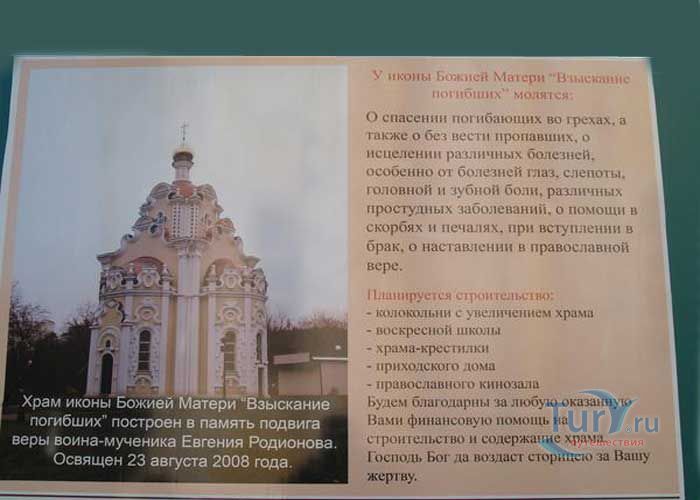 Православная церковь иконы Божьей Матери "Взыскание погибших" находится в городе Харькове, неподалеку от памятника воинам-интернационалистам, которые погибли в Афганистане. Икона Божьей Матери Взыскание погибших - это образ, перед которым матери молятся о своих погибших детях. Инициатором возведения такой церкви был Харьковский областной Союз ветеранов Афганистана. В октябре 2007 года состоялась закладка капсулы со святыми мощами, а также освящено место, отведенное под строительство храма. 23 августа 2008 года храм освятили в честь иконы Божьей Матери "Взыскание погибших", и в память о подвиге 19-летнего Евгения Родионова, который в 1996 году попав в плен возле города Бамут в Чечне, провел с друзьями 100 дней в плену и после отказа принять ислам был обезглавлен. Евгений почитается как воин-мученик.