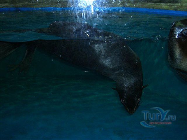 В другом аквариуме, том, который справа, живет пара морских котиков. Самец Горец и самка Звезда. Они прибыли с берегов о. Беринг. Они виртуозно плавают, ныряют и даже спят на воде, а играя, ловко выпрыгивают в воздух подобно дельфинам. Звезда очень активная и баловливая. Горец, наоборот, очень скромный и тихий морской котик.