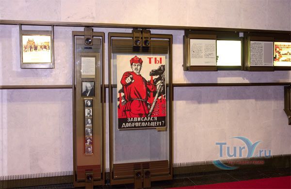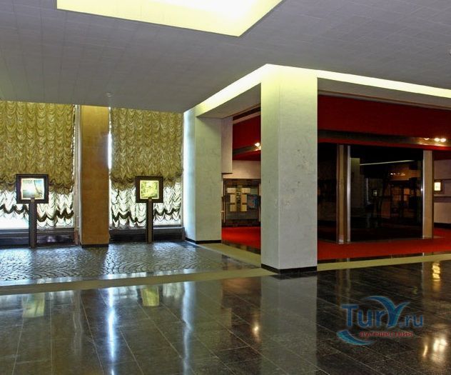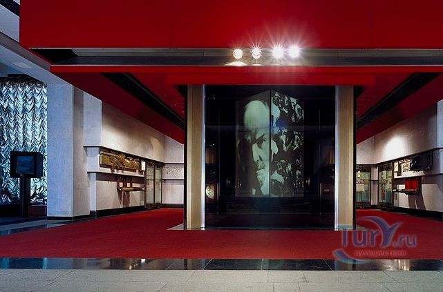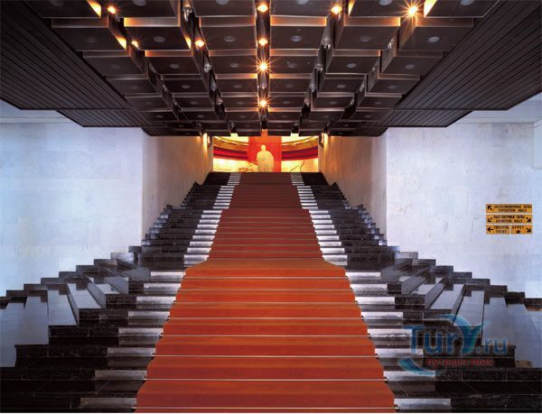 Интерьер здания представляет собой уникальную инсталляцию. Пройдя сквозь колоннаду, оказываешься перед низким входом в музей. Потолок вестибюля из темного металла еще больше прижимает пространство, давя своей зеркальной горизонталью. Черный мрамор ступеней главной лестницы, окантованных сталью, отражает свет сотен миньонов. Бронзированные светильники напоминают ритуальные факелы древних сакральных пещер. С первого этажа виден сверкающий нимб, осеняющий вождя. Эффект создает латунная сфера, подвешенная к потолку аванзала.