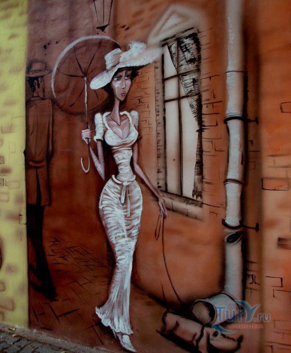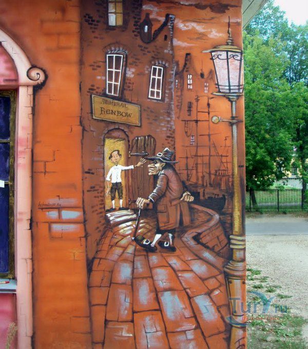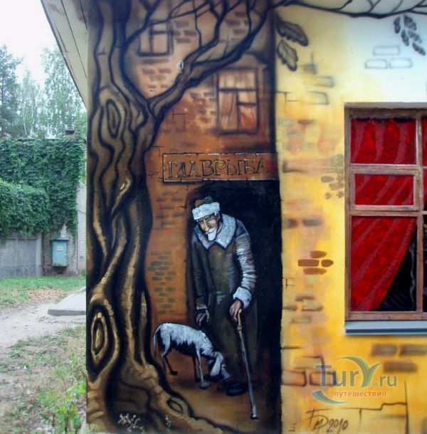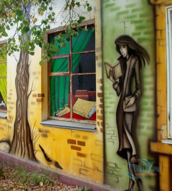 Достаточно интересные настенные рисунки встречаются по всему городу в самых неожиданных местах с различной тематикой, сохранилась даже "роспись" Советского периода. Самым интересным зданием является книжный магазин на улице Сахарова, дом 2. Маленький, но со всех сторон украшенных "росписями".