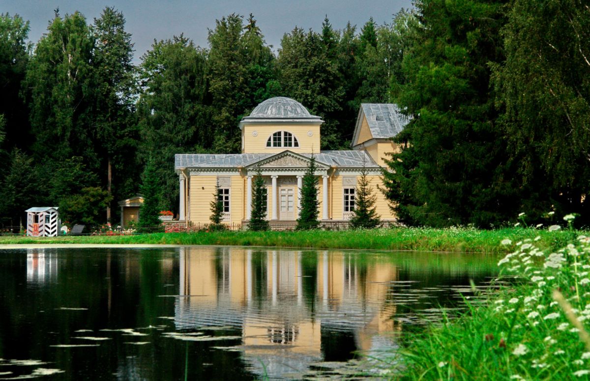 Розовый павильон располагается на месте, где соединяются между собой четыре парковых района - Белая береза, Парадное поле, Старая Сильвия и Новая Сильвия. На берегу пруда, рядом с аллей, ведущей в сторону дворца, в 1799 году построил дачу брат друга детства Павла I князь Алексей Куракин. В 1806 году ее купил и перестроил князь Л. Багратион, а в 1812 году проданный в казну дом был перестроен А. Воронихиным в парковый павильон.