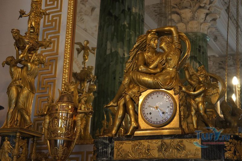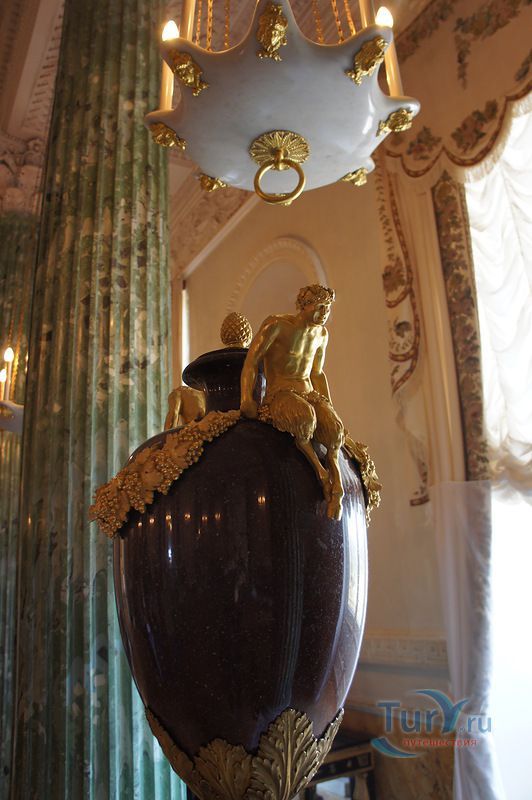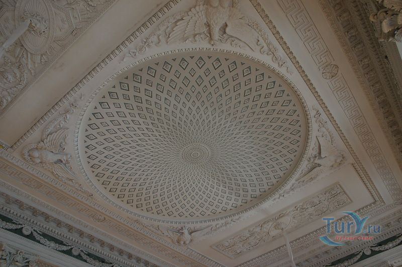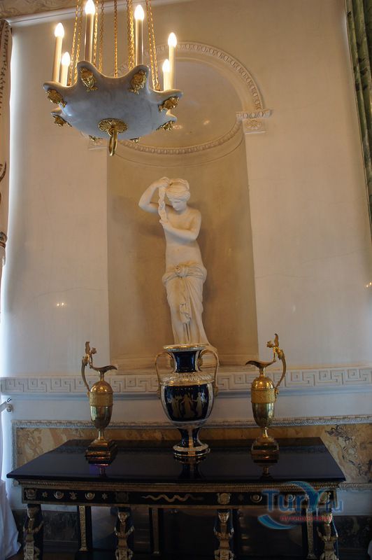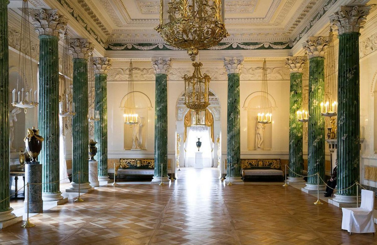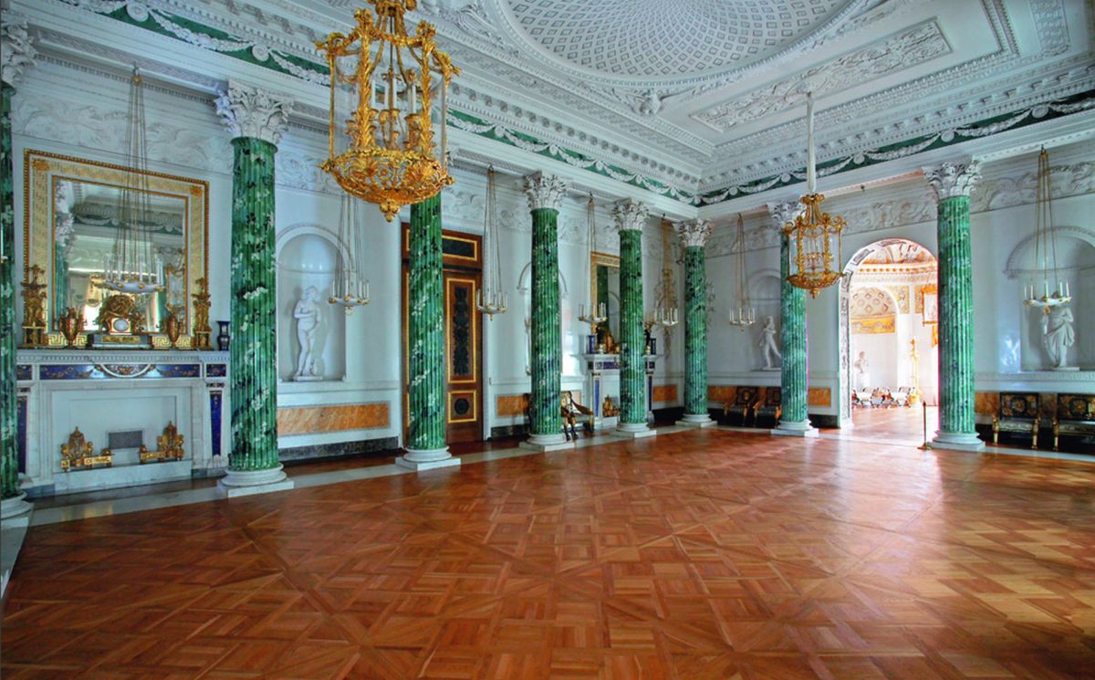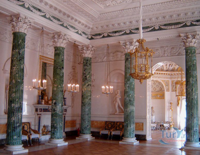 Греческий зал относится к парадным помещениям II этажа Павловского дворца. Из всех интерьеров дворца особое место занимают Итальянский и Греческий залы. Здесь проводились парадные приемы и балы. Огромный Греческий зал соседствует с залом Войны. Созданный Ч. Камероном, В. Бренной, зал позднее был восстановлен А. Воронихиным. Зал получил свое название потому, что он был оформлен в античном духе - по всему периметру колоннада коринфского ордера зеленоватого цвета, античные статуи в нишах, позолоченные светильники, подвешенные на длинных цепях между колоннами. На потолке - роспись, имитирующая украшенный лепкой купол. Насыщенный лепной орнамент в верхней части зала эффектно контрастирует с гладкой белизной искусственного мрамора стен.