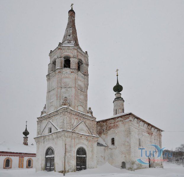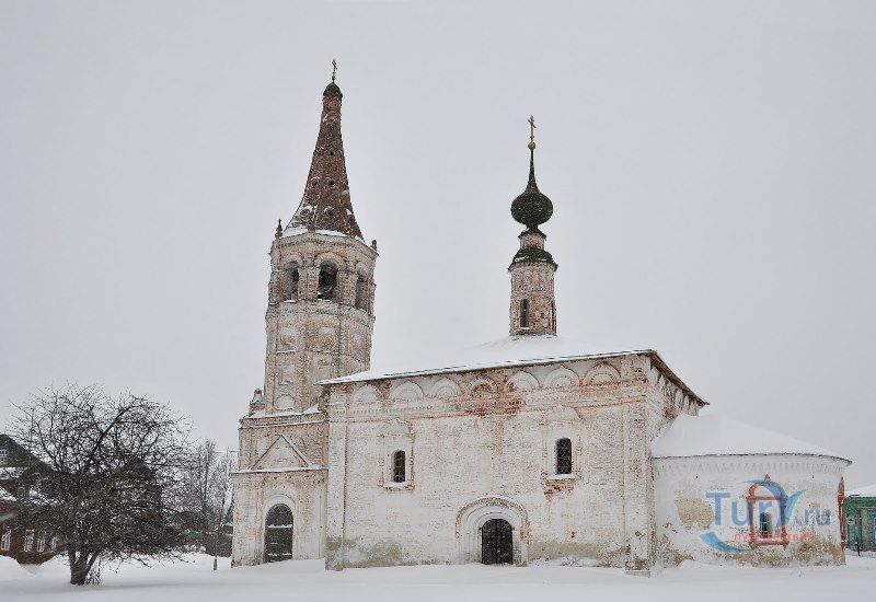 Здание существующей церкви очень нарядно. В его обработке гармонично сочетаются формы XVII века с новыми деталями. Перекрытый сомкнутым сводом куб храма с красивыми порталами и изящными наличниками завершается широким карнизом и поясом мелких кокошников. Над четырехскатной кровлей - стройный вытянутый барабан главы, убранный двумя ярусами аркатур. Небольшой притвор-трапеза связывает основной объем храма с колокольней. Она особенно хороша по своим пропорциям и деталям. В основе ее композиции лежит древний тип шатрового деревянного храма "восьмерик на четверике". По углам четверика поставлены крошечные шатровые башенки. В основании граней восьмерика повторен мотив карниза храма - кокошники, ширинки, барочные восьмигранные ниши и широкий карниз с зубчиками и лентой цветных изразцов. Он декорирован рустованными столбами с карнизами, профилированными арочными проемами. Насыщенность убранства усиливается в высоту: от очень простого низа она нарастает кверху. Углы восьмерика, повторяя мотив нижнего яруса, завершаются миниатюрными пирамидками с крестами, напоминающими готические фиалы. Они подчеркивают монументальность и высоту шатра. Его вогнутая форма - изобретение суздальских мастеров. Традиционные оконца-слухи сменились круглыми люкарнами; только в верхней части шатра помещены крошечные наличники, усиливающие впечатление его ракурса и высоты. Колокольню завершает главка с шлемовидным покрытием.