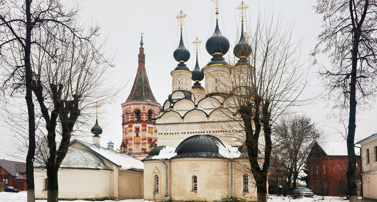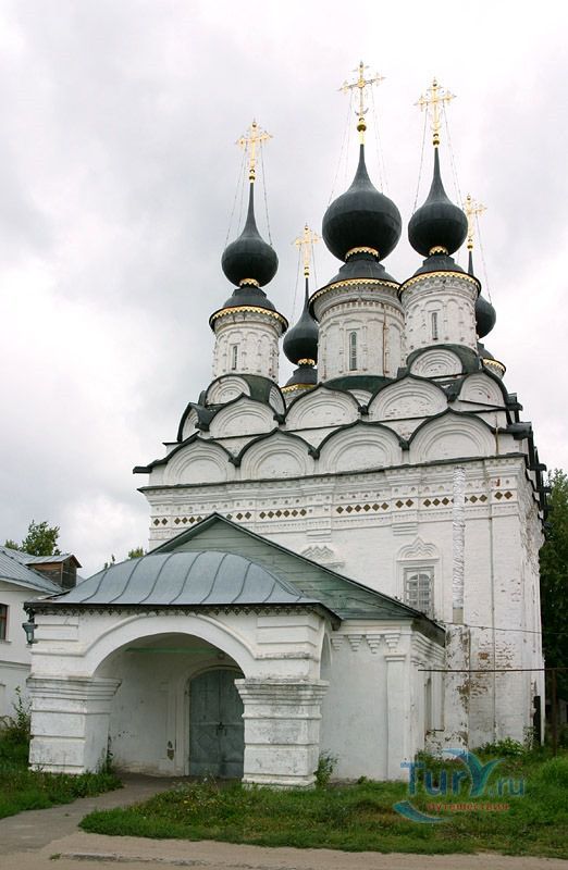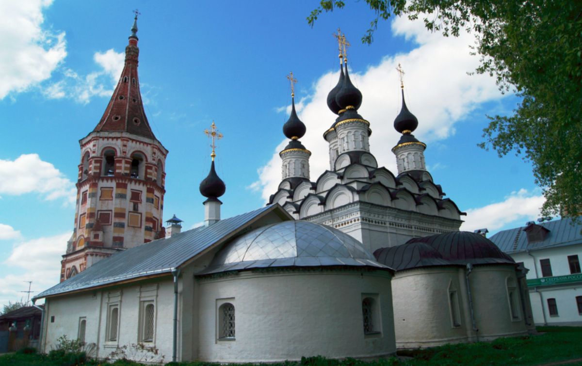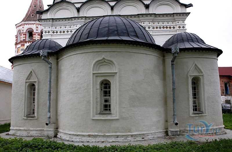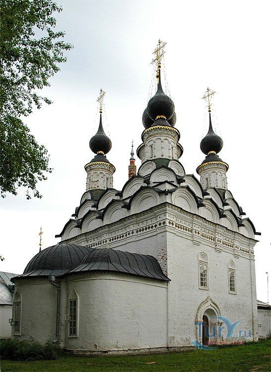 В ее архитектуре впервые появляются декоративные приемы и детали, которые впоследствии станут характерными для суздальских храмов XVII - XVIII веков. Купола с нарядными световыми барабанами - одни из самых красивых в Суздале. В карнизе церкви впервые были применены изразцы, на каждом из фасадов - разные порталы. Каждая из главок поставлена на богато украшенные подковообразные кокошники. В плане церковь представляет квадрат, с вытянутыми на восток тремя абсидами, с запада помещение трапезы, перекрытой коробовым сводом с лотком на запад. В центральной части имеется два столба. Главной архитектурной особенностью памятника является конструкция системы сводов, перекрывающих центральную часть здания. Внутренние столбы поддерживают подпружные арки, перекинутые на стены. Арки в свою очередь соединены между собой и со стенами приниженными коробовыми сводами. В центре всей системы - в разрыве между столбами, образуется квадрат, на который при помощи парусов поставлен барабан центральной главы. Аналогичные разрывы в сводах устроены и в угловых помещениях, также образующие квадраты с парусами, на которые поставлены остальные четыре световых барабана. На фасадах здания три портала. Верхняя часть фасадов имеет карниз, состоящий из декоративных закомар.