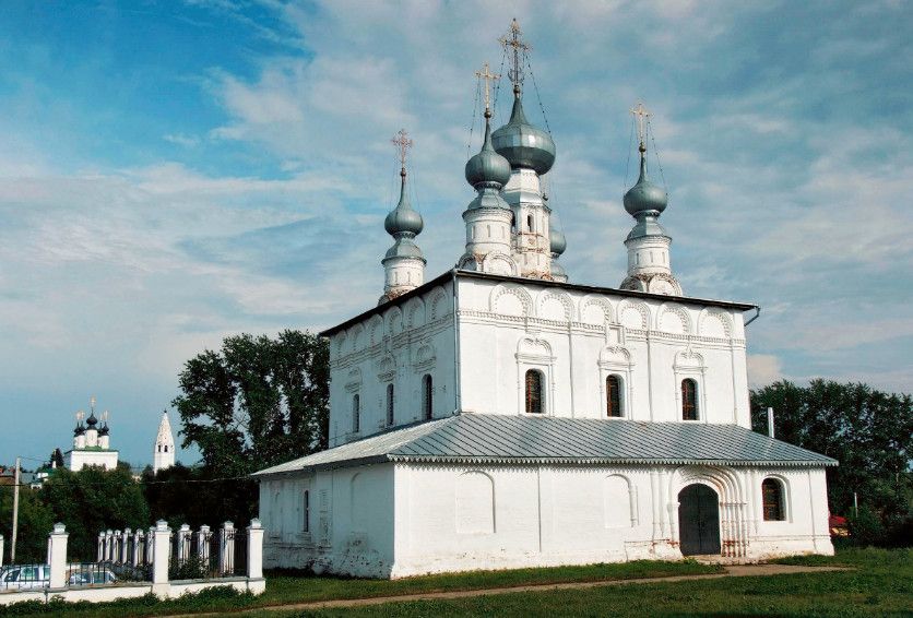 Петропавловская церковь была построена в 1694 году в Никольской слободе, у самых стен Покровского монастыря. Строилась она по заказу монастыря и под наблюдение суздальского митрополита - Иллариона, который следил за исполнением нововведений патриарха Никона. Церковь строилась с учетом всего ансамбля Покровского монастыря, главному собору которого к тому времени уже было почти 200 лет. Перед суздальскими зодчими стояла задача органично вписать новую церковь в пейзаж монастыря. В итоге получилась пятиглавая церковь с куполами луковичной формы, под стать Покровскому монастырскому собору. Большой массив основного клуба имеет с западной стороны паперть, а с северной - придел. Фасады декорированы оконными наличниками с арочками, заостренными в центре, красивыми перспективными порталами и карнизом, состоящим, из полукруглых кокошников с поребриком. Внутреннее помещение имело лепные барочные рамы, как на стенах, так и на сводах, с расписанными внутри них картинами из священного сюжета. Часть этих украшений сохранилась до наших дней. К северо-западному углу основного здания церкви примыкала колокольня. Нижняя ее часть имела в основании куб, с большим круглым столбом в углу, от которого на стены паперти были перекинуты арки. На них находился четверик - куб и восьмигранник со звонами вверху. Восьмерик завершался прямолинейным широким шатром. Эта монументальная и грузная форма колокольни отличалась от стройных колоколенок Суздаля. Позднее колокольня и весь северо-западный угол паперти были разобраны при переустройстве здания.