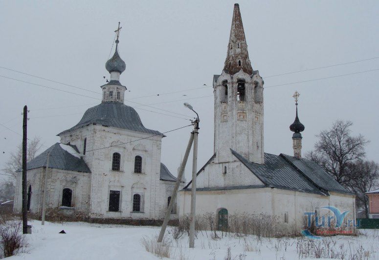 Тихвинская церковь расположена на улице Шмидта, на невысоком холме, вдоль края Ильина луга. Эта церковь - единственное здание, которое сохранилось от Андреевского монастыря. В древние времена на этом месте находился Андреевский монастырь, сожженный в период польского нашествия. В описи Суздаля 1628 - 1629 годов на этом месте упоминаются две деревянные церкви - Андрея Первозванного и Петропавловская, которые затем заменили каменной церковью, переименованной в Тихвинскую с престолом Андрея Первозванного. До наших дней она дошла не полностью: отсутствуют алтарная часть и паперть с колокольней. Сохранившаяся часть здания представляет большой интерес как образец суздальской архитектуры конца XVII века. Высокий массивный куб украшен парными полуколонками по углам. Пышный карниз из разнообразных тесаных кирпичей с полукруглыми арочками завершает верхнюю часть стен. На боковых фасадах имеются единственные для суздальских памятников троечастные наличники, оформляющие два окна вместе и киот посередине. Кровельное покрытие на четыре ската завершает барабан с кокошниками-арочками, глава фигурная на узкой шейке.