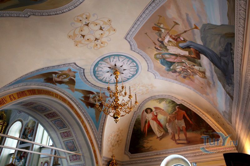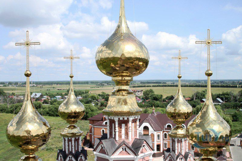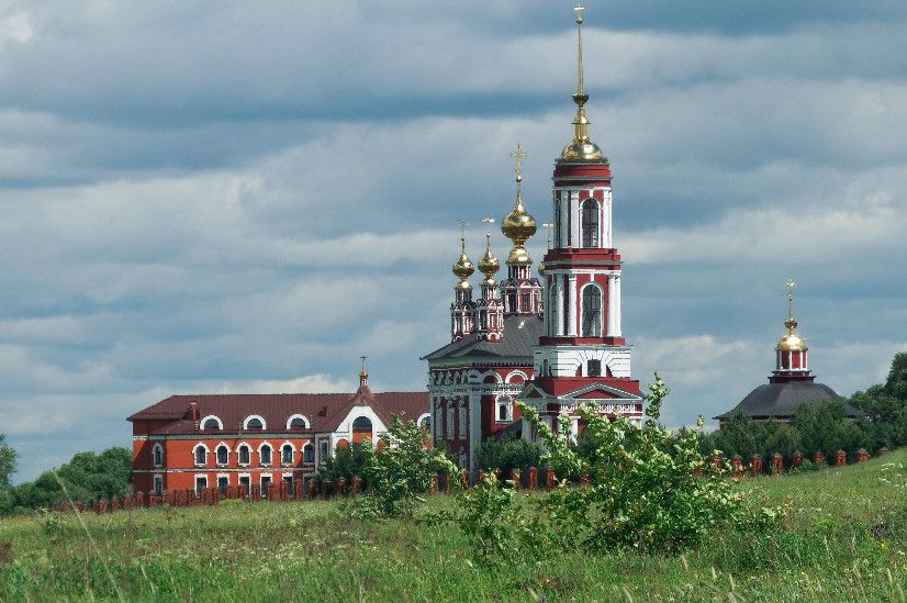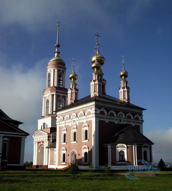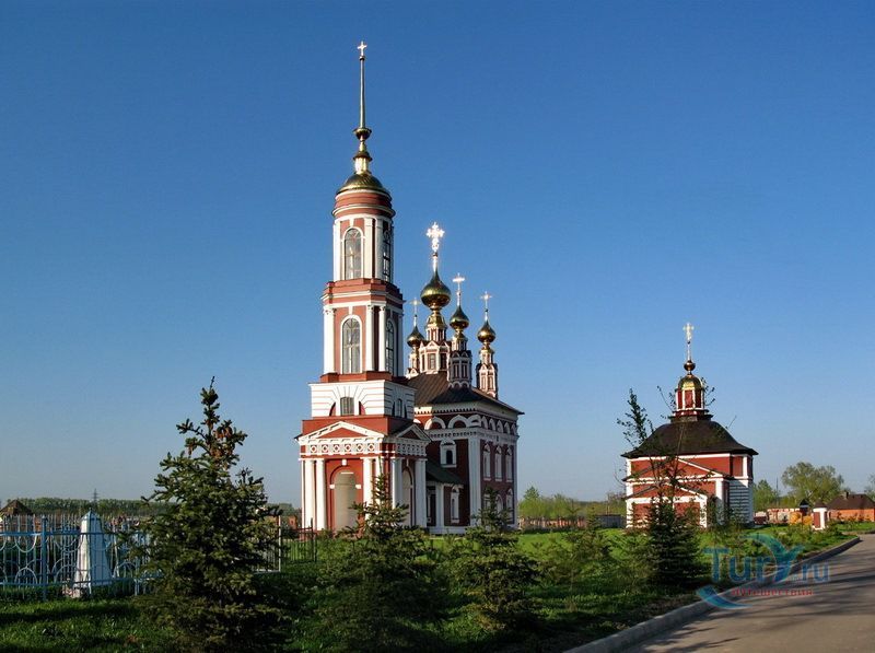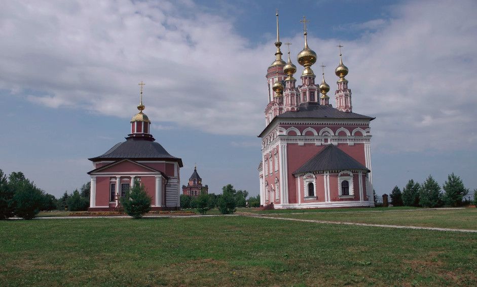 Церковь Михаила Архангела с колокольней - это самая высокая из трех церквей в Михалях. "Летняя" пятиглавая церковь с колокольней была построена в 1769 году. Ее высокий четверик отличается богатым декором: оба яруса окон обрамлены пышными наличниками, выделяющимися белым цветом на темно-красном фоне стен. Колонки наличников - ребристые, что придает им еще бóльшую узорчатость. Над вторым ярусом окон проведен богатый поясок, а под кровлей, немного выше - карниз. Центральный, световой барабан наряднее остальных; крест центральной главы украшен более сложным рисунком. С запада к церкви пристроена трапезная, соединяющая основной объем с высокой колокольней в стиле классицизм. Венчает колокольню стройный острый шпиль, опирающийся на сферический купол-основание. По своей композиции и по декору колокольня близка к самой высокой точке Суздаля - Преподобенской колокольне Ризположенского монастыря.