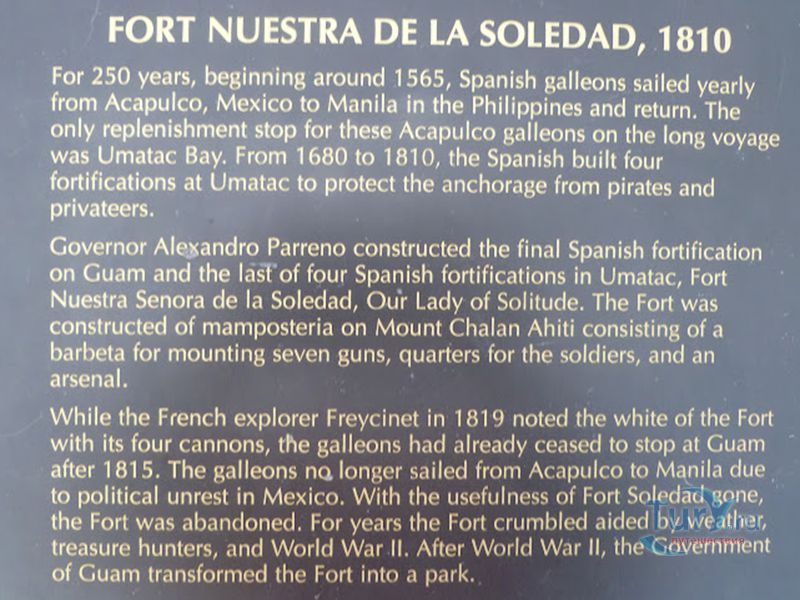 Форт Соледад – последний из четырёх испанских фортификационных сооружений, построенных в районе деревни Уматак. Начиная с середины XVI века испанские галеоны, преодолевавшие маршрут из Акапулько в Манилу, делали на Гуаме свою единственную остановку. Дабы защитить отдыхающих моряков от нападений пиратов и других возможных противников и была возведена эта фортификационная система. Форт Соледад был возведен в 1810 году на горе Чалан-Ахити методом традиционной каменной кладки. Здесь размещалось семь пушек, расквартировывались солдаты и стоял арсенал. Однако славной историей разжиться форт не успел. Очень скоро Испания была вынуждена прекратить транспортное сообщение с Мексикой, а остров Гуам потерял стратегически-важное значение.