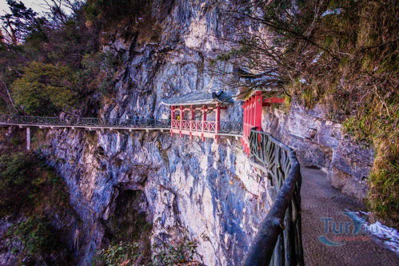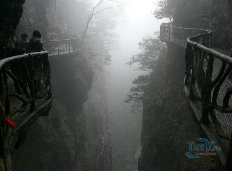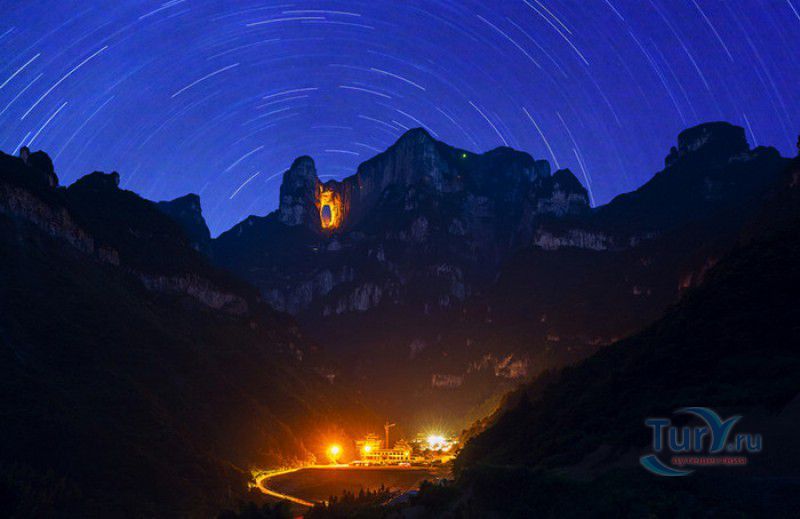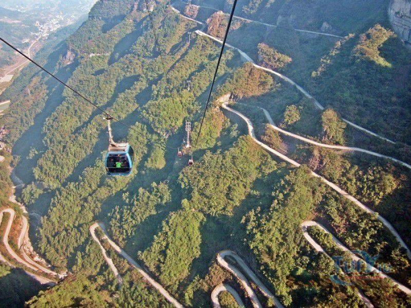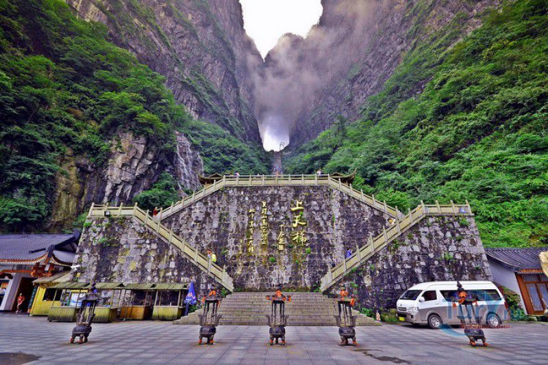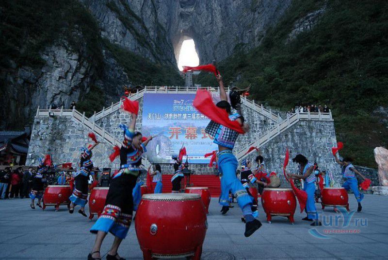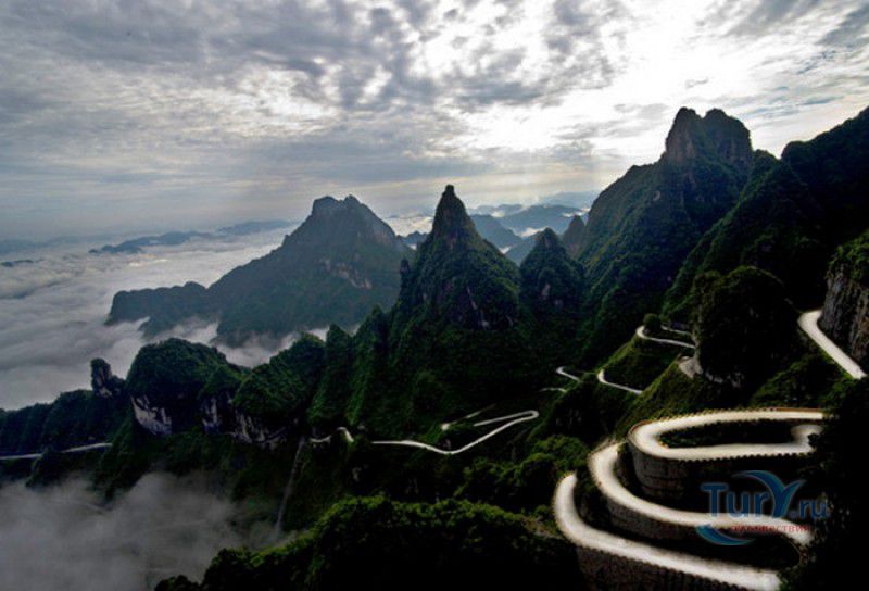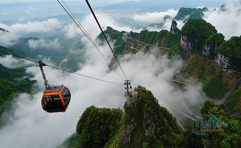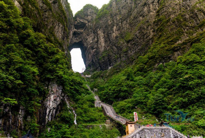 Гора Тяньмэнь (Тяньмэньшань) расположена на северо-западе провинции Хунань, в 8 км от центра города Чжанцзяцзе. Тяньмэньшань является одной из самых известных и посещаемых достопримечательностей Национального парка Тяньмэнь. Тяньмэньшань - первая гора в Чжанцзяцзе, которая была точно измерена специалистами, её вершина находится на высоте 1518,6 метров над уровнем моря. Мировую известность гора получила благодаря самой высокой в мире пещере, образованной в результате эрозии скальной породы. Пещера появилась в 263 году, когда большой кусок горы внезапно отвалился, образовав огромный проём высотой 131,5 метров, шириной 57 метров и глубиной 60 метров. Местные жители верят, что гора заключает в себе сверхъестественные, мистические силы, а пещера - это Небесные врата, которые охраняют Восемь Бессмертных. Очевидцы рассказывают о невероятном природном явлении - несколько раз во время значимых для страны событий (в 1949 году - образование КНР, в 1976 году - смерть Мао Цзэдуна, в 1989 году - подавление студенческих выступлений в Пекине и в 1998 году - крупнейшее наводнение В Китае) с вершины горы обрушивались потоки воды. Каждый раз водопад длился четверть часа и потом неожиданно прекращался. С давних времён ходят слухи о спрятанных в пещере несметных сокровищах, привезенных сюда одним из руководителей крестьянского восстания во времена правления династии Мин. Сотни кладоискателей покоряли вершину горы Тяньмэнь в надежде найти клад. Пока все попытки тщетны. А ещё говорят, что на горе живут единороги. Но и без мистики гора Тяньмэньшань привлекает тысячи туристов со всего мира своими потрясающими пейзажами. К вершине горы ведёт самая длинная в мире канатная дорога, её протяжённость - 7455 метров, количество кабин 98, перепад высоты - 1279 метров. В некоторых местах канатная дорога резко поднимается вверх под углом 37º, буквально "врезаясь" в облака. Автомобильная дорога, проложенная от подножия горы к её вершине, совершает 99 поворота, длина трассы - 11 километров, расстояние между поворотами от 200 до 1300 метров. Горный серпантин называют "Небесное шоссе". Непосредственно к пещере Небесные врата можно подняться по крутой лестнице, состоящей из 999 ступеней, время подъёма по ней - около 30 минут. От станции канатной дороги на вершине Тяньмэнь начинается пешеходный маршрут по проложенным по самому краю пропасти тропам, длина маршрута - 800 метров, а высота, на которой окажутся любители острых ощущений - 1400 метров над уровнем моря. Самый захватывающий участок - это стеклянная тропа. Прежде чем ступить на стеклянный пол, посетителей попросят надеть бахилы, и после этого можно "пройтись" по облакам. Виды, открывающиеся отсюда, очевидцы описывают как "волшебные", "потрясающие" и "невероятные". На самой вершине горы расположен буддийский храм, построенный во времена династии Тан. Храму уже более 500 лет, он и по сей день является одним из главных мест паломничества в провинции Хунань.