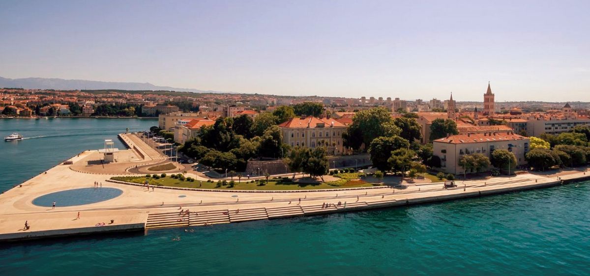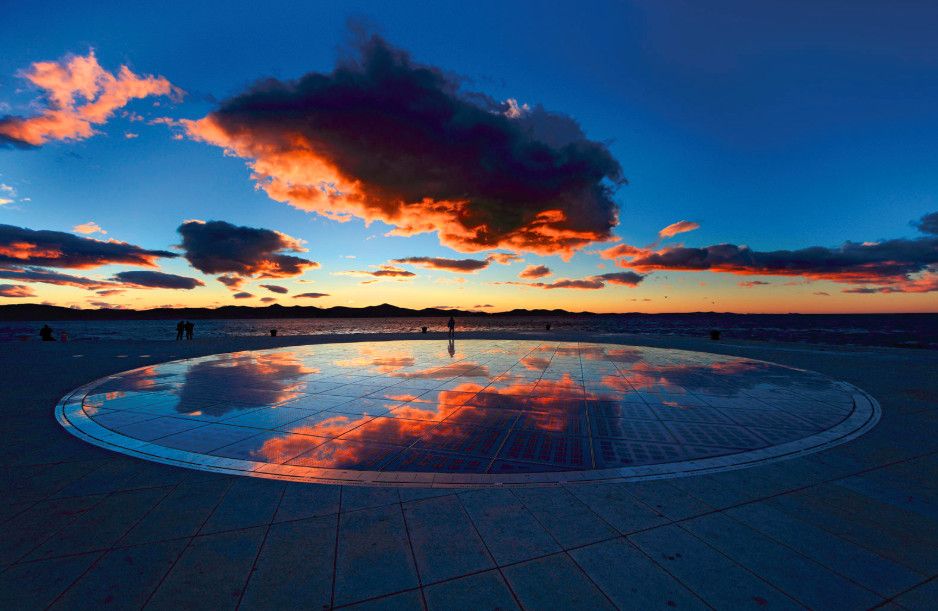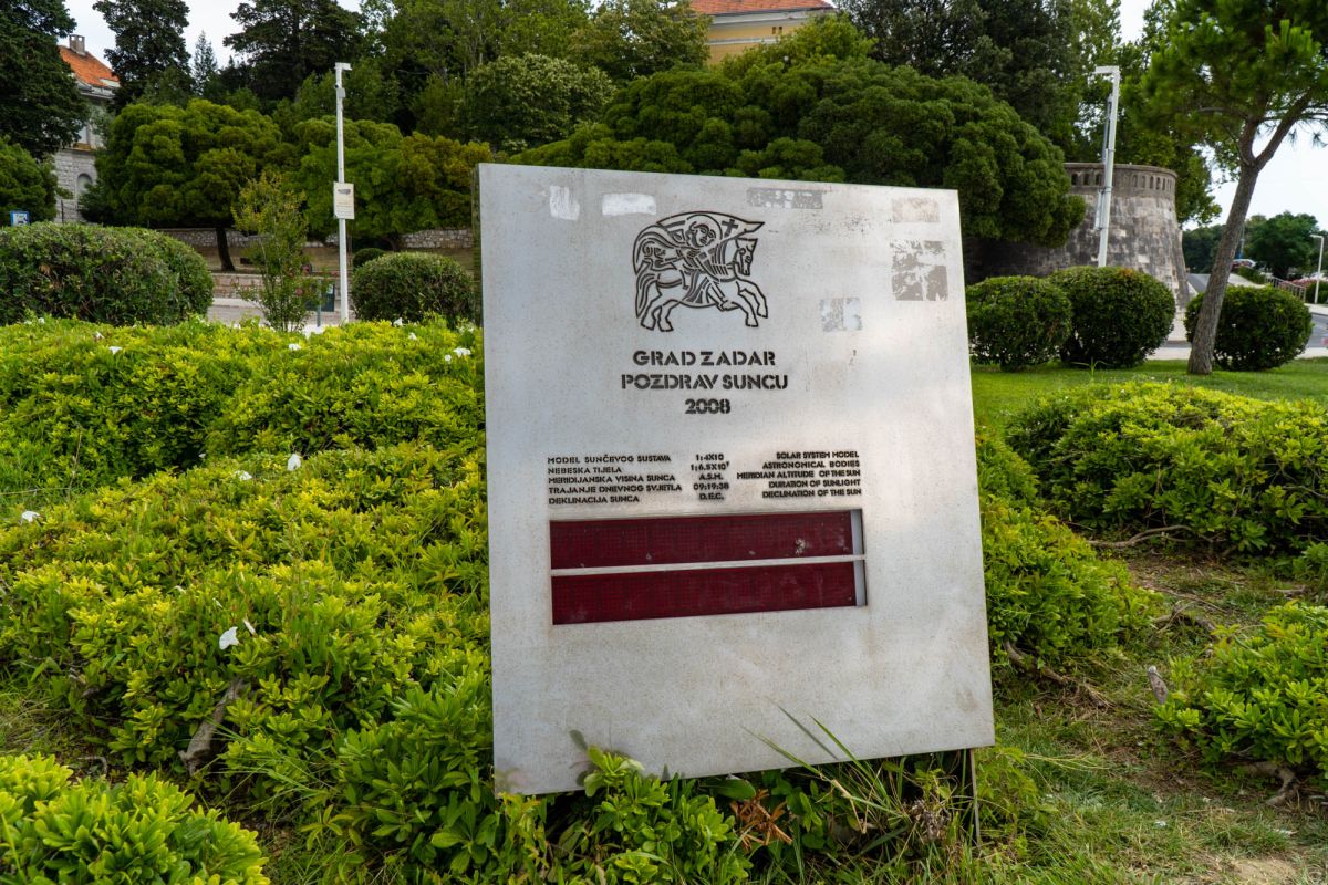 Приветствие солнцу расположено на набережной Петра Крешемира IV. Оно появилось в 2007 году рядом с еще одним необычным сооружением Николы Башича - Морской орган. Данная светодиодная световая инсталляция воспроизводит существовавший в Задаре в XIII веке календарь. Один диск диаметром 22 метра и рядом два диска меньшего размера символизируют планеты солнечной системы.
