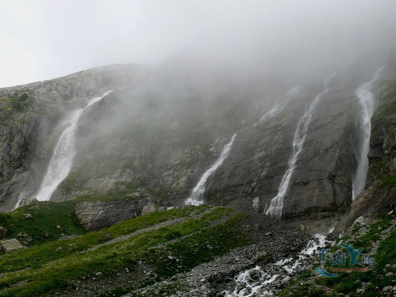Софийские водопады являются самыми крупными в Архызе. Они расположены на склоне горы София, на высоте практически 2500 метров. С шумом и грохотом ледниковые воды падают из могучего Софийского ледника в одноименную долину, стихая лишь далеко внизу, на зеленой равнине. Ледник, питающий водопады, находится под самой вершиной горы. Текущие со склона двухкаскадные потоки воды образуют цепь из нескольких водопадов высотой до 100 метров. Их называют пульсирующими, поскольку потоки воды в них непостоянны, их пик приходится на паводковый период июля - августа, время наибольшего таяния снегов в горах.