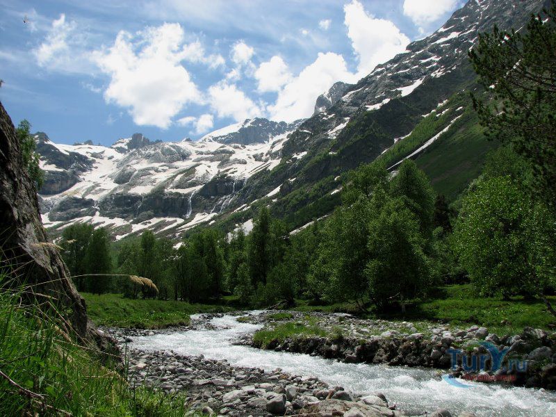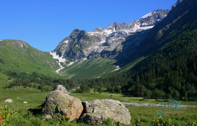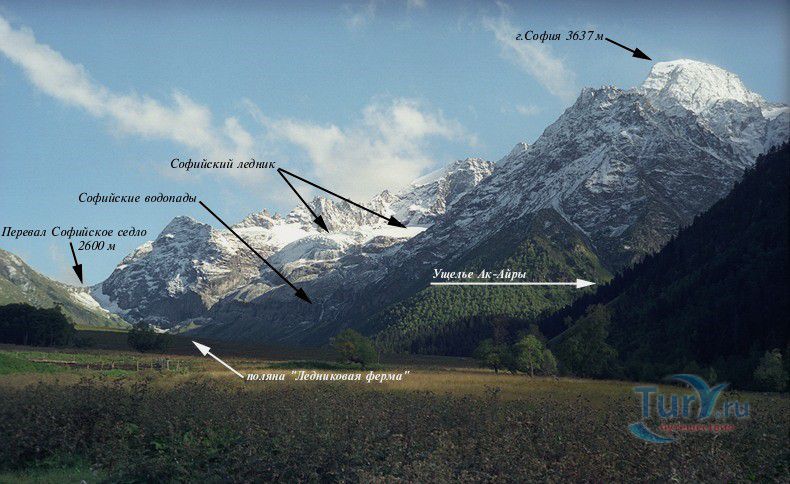 Гора София является символом Архыза. Гора расположена на отроге Главного Кавказского хребта. Свое название она получила благодаря запоминающейся форме, напоминающей купол византийского храма, при более близком рассмотрении - массивный каменный трон с ледяной подушкой. Гора высотой 3637 метров является второй вершиной Архыза. Помимо вершины, восхождение на которую представляет интерес для альпинистов, еще сюда туристов привлекают как минимум 3 объекта: знаменитые Софийские озера, Большой Софийский ледник и Софийские водопады. От ледника вниз в долину через высокий скальный порог обрушиваются водопады, которыми начинается река София. Напротив ледника и стены с водопадами расположена ферма, где можно купить свежего парного молока. К востоку от вершины находится перевал "Софийское седло". Вся Софийская долина представляет собой субальпийские луга, разделенные полосами лесов. Она служит огромным пастбищем для овец, коров, лошадей.