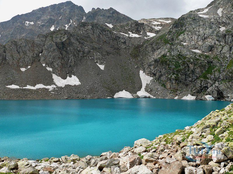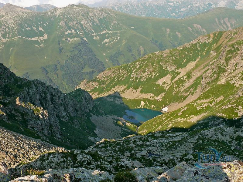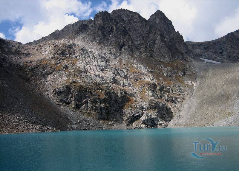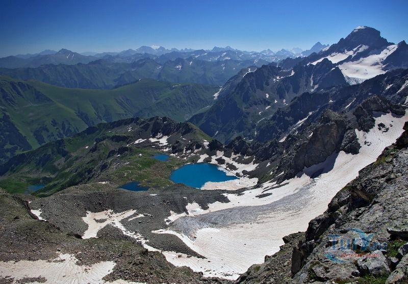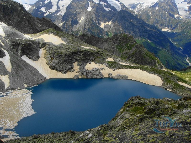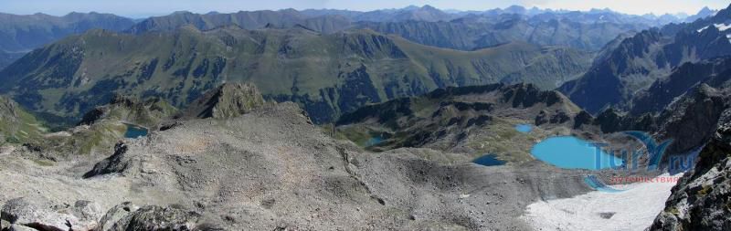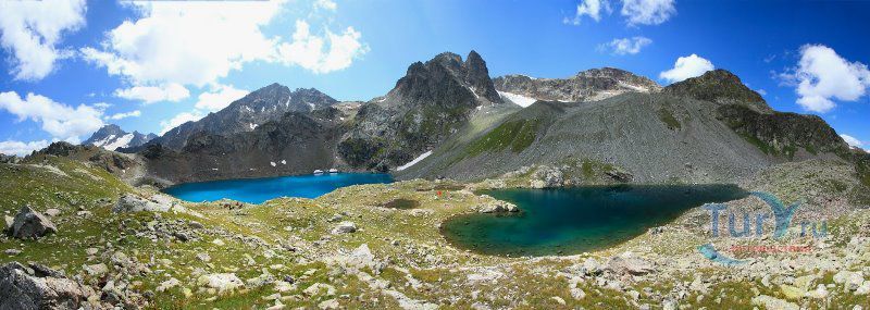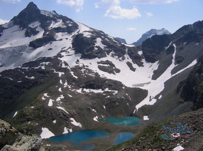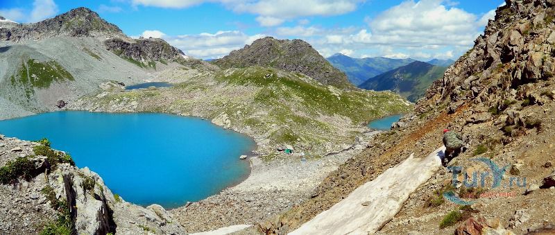 Софийские озера - это группа из трех крупных и ряда мелких озер, расположенных в цирке массива Кель-Баши. Они находятся на высоте 2830 метров, в лощине Кашха Эки Чат. Самое высокое из них - Северное, южнее его располагается Большое озеро, окруженное скалами Кель-Баши, ниже и восточнее Большого лежит Нижнее озеро. Название "Большое" говорит само за себя. Оно и самое большое, в диаметре около 300 метров, и самое глубокое, по слухам, его глубина около 17 метров. Вода в Большом озере лазурно-голубого цвета. Второе озеро значительно меньше, вода в нем цвета чистой небесной голубизны, а третье - как полированный черный мрамор. Вскрываются они ото льда в июле, отдельные льдины не таят все лето. На перемычке между Северным и Большим озерами расположено несколько микроскопических озер, имеется много подготовленных мест под площадки.