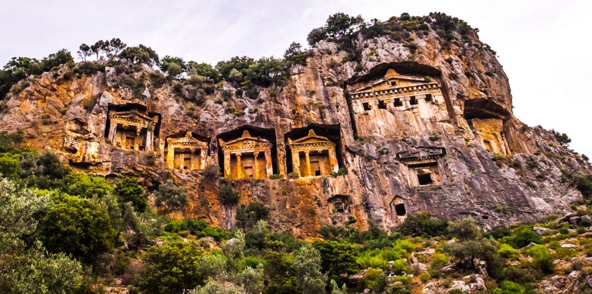 Древний город Каунос расположен на высоте 152 метра над уровнем моря, а акрополь находится на юго-западе города. Небольшая башня на полуострове, имеющая высоту около пятидесяти метров возведена в виде языка, расстилающегося между двух холмов в сторону моря. В течение древней и начала классической эпохи стены города, построенные на задней стороне Кауноса, Маленькой башни и Акрополя, а также внутригородские стены, образовали для города своеобразный защитный щит. Так как до сих пор ещё не на всей территории были произведены раскопки, до конца не ясна точная планировка античного города. Известно лишь то, что он был расширен террасами в период Гекатомнидлера. Предыдущие террасы были восстановлены, а в последующие периоды построены новые и более крупные. Название города упоминается уже в третьем тысячелетии до н.э. Каунос перенес присутствие на своей территории большого количества народов: ионийцев, карийцев, персов, ликийцев, римлян, византийцев и греков. Бейлик Ментеше распространил здесь в 1291 году свою власть, а в 1392 году эти земли были присоединены к Османскому государству султаном Баязидом. Одним из символов Кауноса стали скальные захоронения, датируемые четвёртым веком до н. э. Эти ясно виднеющиеся из Дальяна могилы использовались также во времена римлян. В могилах ликийского типа зачастую устанавливали лежак, состоящий из трех камней, На этот лежак укладывали покойника, а фасад могилы оформляли фронтоном и двумя ионийскими колоннами. Однако не ко всем гробницам можно подойти, для самых отважных здесь имеется веревочная лестница. Давно уже истлели останки захороненных здесь людей. Вечную память давно ушедших цивилизаций охраняют две львиные головы, которые с поверхности карийских гробниц смотрят друг на друга. Каунос являлся важным торговым и портовым городом. Со временем бухта в результате иловых наносов утратила свое значение и обмелела. По мнению Геродота, жители Кауноса сами себя называли уроженцами Гирита. Город был основан сыном Милетоса Кауносом, изгнанным из родительского дома из-за запретной связи со своей сестрой. Причал находится в десяти минутах ходьбы от города. Прибывающие сюда на яхтах оставляют свои корабли рядом с островом Деликли и подходят по каналу на шлюпках к причалу. Городской порт располагался в районе озера Сюлюклю у подножия акрополя. Море в те годы было на уровне самого акрополя. Когда вся Анатолия находилась под влиянием Персии, во времена персидского нашествия, Каунос перешел под управление Мавсола. После того как Александр Великий победил персов городом стала управлять принцесса Ада, потом Антигонус, а после Птолемеус. Город входил по очереди в Родосское и Бергамское королевства. Фрагменты расположенных на северной стороне стен являются средневековыми постройками. Самая длинная стена начинается от северной стороны порта и тянется до отвесных скал около деревни Дальян. Северная часть стены была возведена во времена правления Мавсола. Строения в северо-западной стороне были возведены во время эллинского периода, а те, что расположены непосредственно около порта, принадлежат еще более ранним эпохам. У подножия акрополя находится театр. Его партер насчитывает тридцать три ряда сидячих мест. Одна из расположенных к западу от театра построек, представляет собой церковь наподобие бази