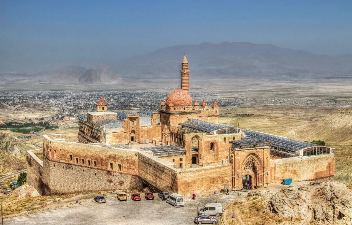 Дворец Исхак Паши является одним из наиболее масштабных и красивейших – немногие достопримечательности Турции могут похвастаться такой грандиозностью строения. Дворец был построен в последнем периоде Османской империи, уже после дворца Топкапы и является последним памятником ренессанса империи. Этот грандиозный дворец увлекает своей мощью и красотой. Его ценность состоит в том, что он представляет собой жемчужину тюркского архитектурного дела и конечно является дорогим произведением искусства. Расположен дворец на скалистой земле, которая близко расположена к равнине. Дворец Исхак Паши включает в себя множество архитектурных сооружений. Это фасад, дворы, гостиная, мечеть, кухня, бани, гарем, залы церемоний, арки, кладовые боеприпасов и продуктов, мавзолей, пекарня и подземелье. Немногие музеи Москвы могут похвастаться таким богатством экспонатов. Строительство дворца было начато в 1685 году и было закончено только в 1784 году. Занимает он площадь размером 115 на 50 метров. Архитектура дворца отражает черты, свойственные османской, сельджукской и персидской эпохам. Приезжающим туристам следует знать, что дворец представляет два двора, в которых находятся вспомогательные помещения. К сожалению, помещения, которые находятся на первом этаже, полуразрушены в настоящее время. А вот второй двор сохранился лучше и там все помещения представляют собой квадратную форму. Если заходить во дворец справа – то будет мужская половина, а за ним идет женская половина. Мечеть и мавзолей находятся в самом конце двора. Дворец Исхак Паши делится на два этажа, которые включают в себя 356 комнаты. В каждой комнате присутствуют камины из камня, в древние времена все комнаты отапливались центральной отопительной системой. Именно этим и прославился, стоящий рядом, город Дооубаязыт. Интересно, что самая первая система центрального отопления была установлена впервые в мире в этом городе. Мавзолей дворца построен тоже из камня, состоит из двух этажей и представляет собой архитектуру сельджуков. В мавзолее покоятся Чолак Абдул Паши, Исхак Паши и их родственники. В настоящее время дворец Исхак Паши является одним из популярных туристических комплексов. Туристы приезжают не только ради архитектурных сооружений. Здесь также очень красивые лесистые предгорья, красивейшие долины и горные пейзажи.