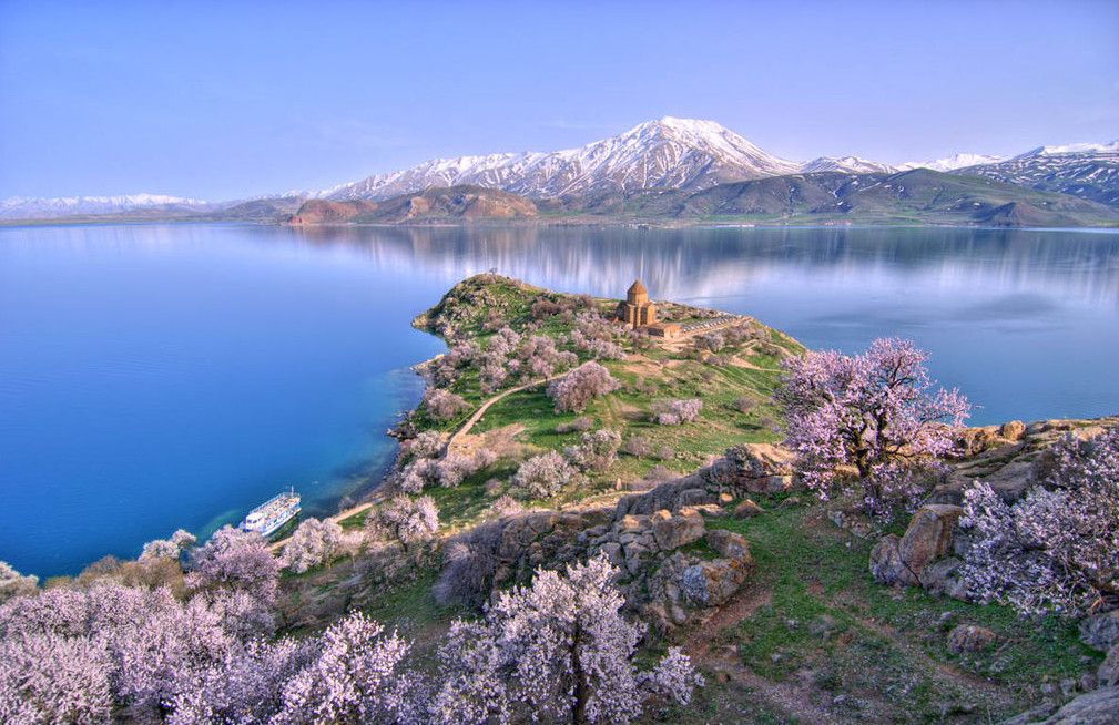 Озеро Ван - одно из самых экзотичных на нашей планете. В незапамятные времена извержение вулкана Немрут создало своеобразную «плотину», благодаря которой образовался гигантский водоем с крайне необычным составом воды. Озера бывают пресные и соленые, а Ван - содовое. Пить такую воду нельзя, а вот стирать в ней можно без мыла. Более того, из этой воды выпаривают соли для создания экологически чистых моющих средств. При этом она чрезвычайно прозрачная: на глубине пяти-шести метров видно каждый камушек. Минеральная вода из озера успешно используется при лечении переутомлений, нервных расстройств и кожных недугов. Ван - одно из четырех крупнейших бессточных озер планеты, при этом в него впадают три горных речки. Потому в различных участках водоема вода имеет разную минерализацию и плотность. Где-то она почти пресная, а в некоторых местах солонее и плотнее, чем в Мертвом море. Кое-где, лежа на поверхности, можно читать газету, но недолго, потому что холодновато. Есть у здешней воды еще одно необычное свойство - неоднородность цвета. Вероятно, из-за разницы в плотности на фоне яркого ультрамарина может возникнуть то полоса изумрудного оттенка, то абсолютно белое пятно. В озере Ван водится единственный вид рыбы. Эндемический вид лат. Alburnus tarihi (тур. darekh) на самом деле родственный европейской уклейке и принадлежит семейству карповых, однако по внешнему виду сильно напоминает сельдь. Alburnus tarihi может жить как в пресной воде, так и в солёной, максимум до солёности 23 ‰, однако размножается только в пресной воде, в устьях рек и ручьёв, впадающих в озеро Ван. Воды озера смягчают климат близлежащих окрестностей Армянского нагорья, что способствует земледелию и садоводству, позволяя выращивать на высоте 1700 над уровнем моря разнообразные плодовые деревья.