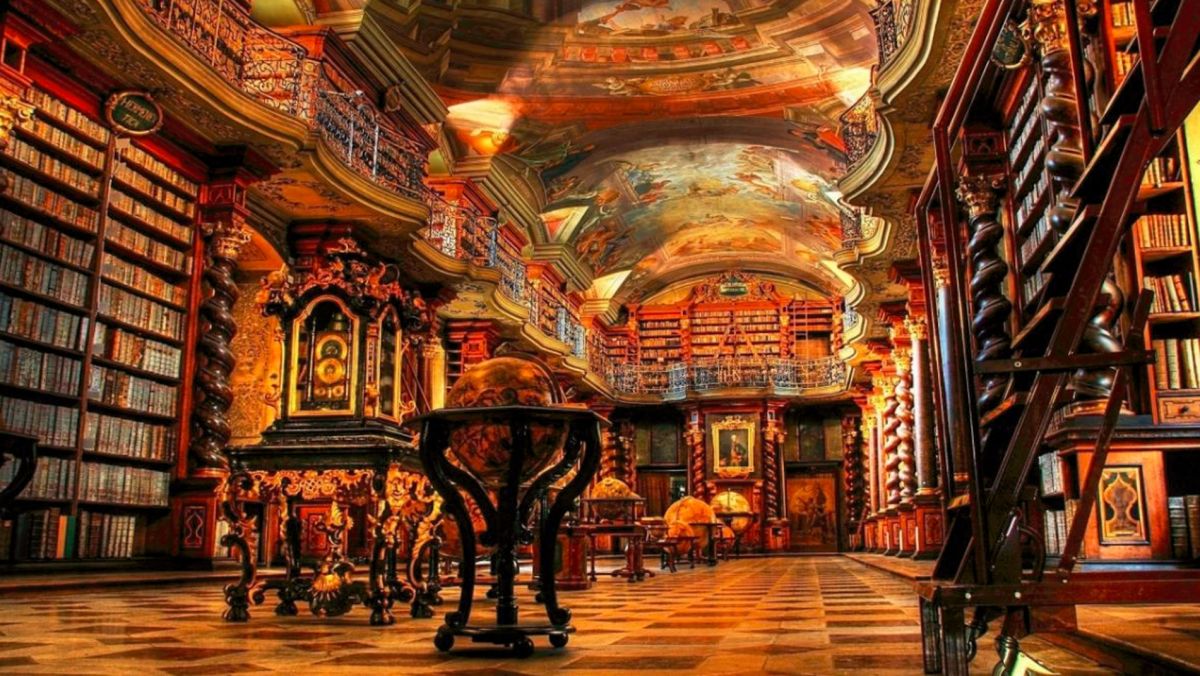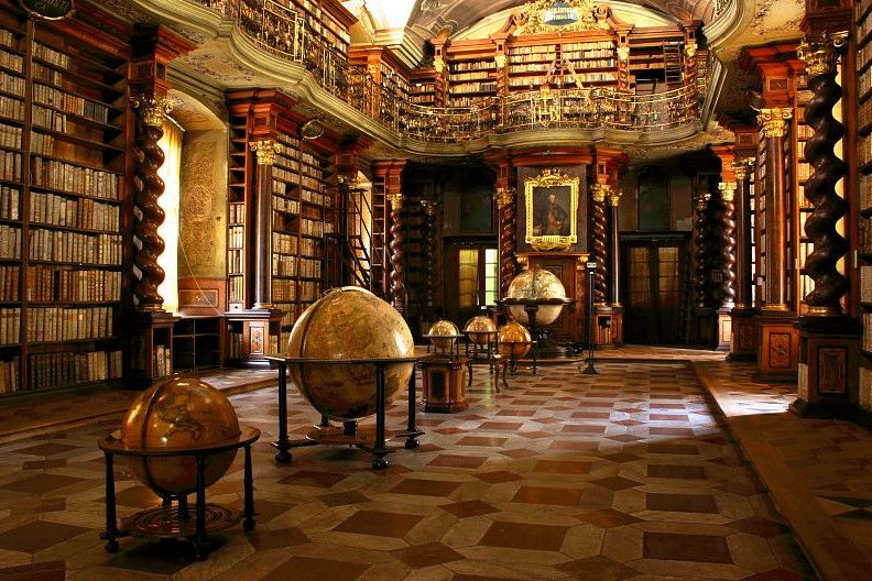 Библиотека в стиле барокко украшена прекрасными фресками на тему Науки и Искусства, а изображения на куполе представляют Храм Мудрости. Здесь хранятся сотни тысяч ценнейших книг по теологии, а центр зала украшают огромные исторические глобусы.