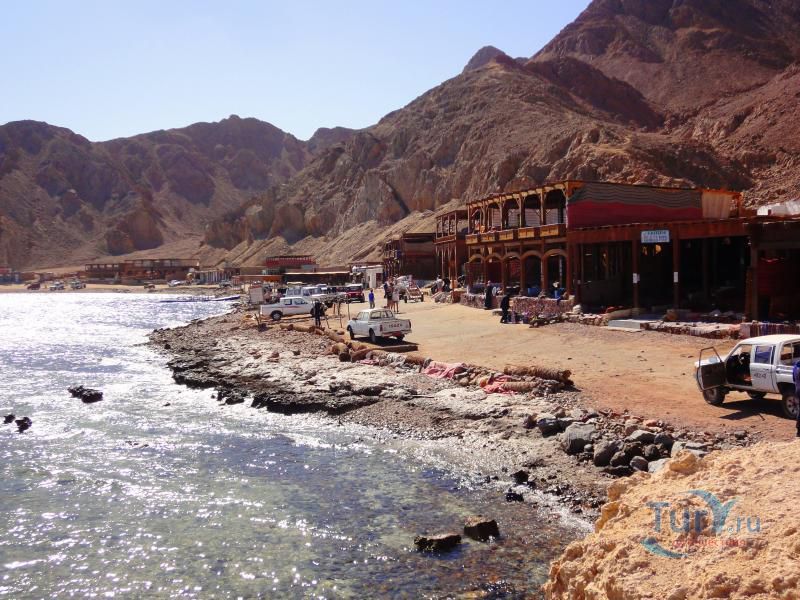 На побережье возле дыры образовался ряд туристических застроек. Прокатные со снаряжением для погружения, сувенирные лавчонки, страшненькие дощатые кафешки, туалеты с душевой.