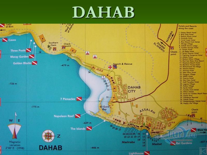 Побережье Красного моря, а точнее залива Акаба, в районе Дахаба почти сплошь усеяно коралловыми рифами. Кое-где рифы подступают вплотную к берегу, как например у городской набережной Дахаба.