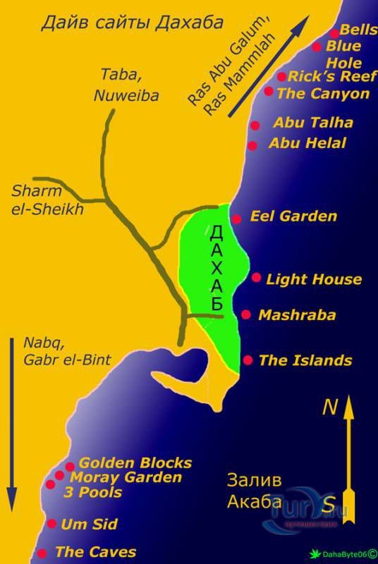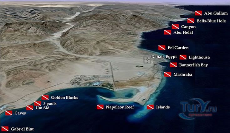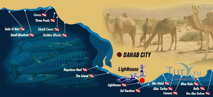 В Дахабе и его окрестностях насчитывается около 20 дайв-сайтов - мест привлекательных для погружений и изучения подводной жизни Красного моря и залива Акаба. В самом Дахабе работает множество Дайв-центров, в том числе и на русском языке, в которых можно взять снаряжение, пройти обучение и отправиться с опытными инструкторами на прогулку по коралловым садам. Новички, только осваивающие премудрости дайвинга, вместе с инструктором отправляются на ближайший риф, например Лайтхаус, где на совсем небольшой глубине удобно отрабатывать учебные упражнения.
