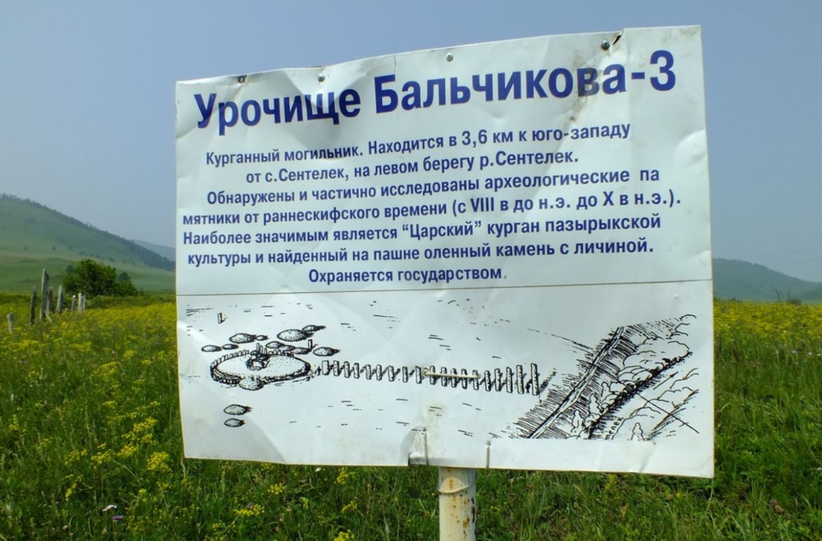 Царский курган возвышается в долине реки Сентелек на территории Чарышского района. Это – уникальный курган скифского времени, относящийся к VI-IV в.в. до н. э., находится примерно в 4 км от села Сентелек.