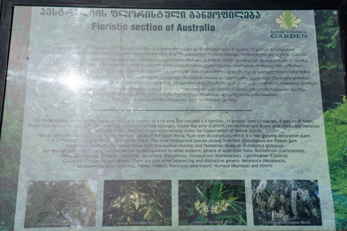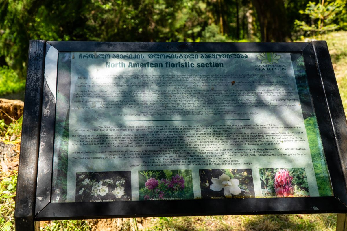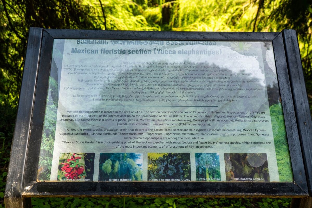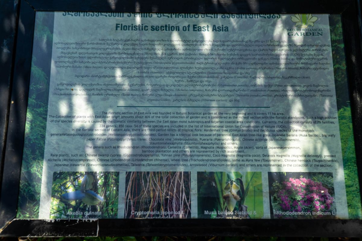 Флористическое богатство сада представлено его девятью разделами. Это разделы Восточной Азии, Северной Америки, Новой Зеландии, Южной Америки, Гималаев, Мексики, Австралии, Средиземноморья и влажных субтропиков Закавказья. Коллекция сада состоит из 2037 единицы древесных пород. Среди них 104 – кавказского происхождения, остальные же – представители иноземной флоры.
