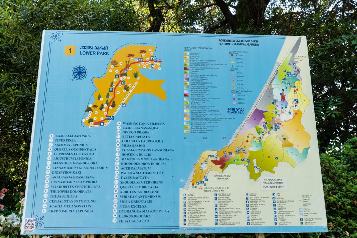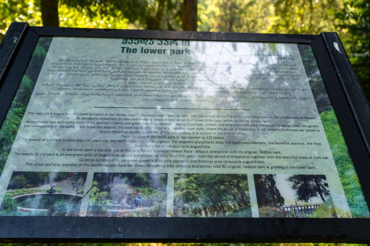 Батумского ботанического сада нет аналогов в мире, в том плане, что здесь сосуществуют разновидности растений, взятые из совершенно разных климатических и ландшафтных зон. Как ни странно, здесь одинаково хорошо прижились как канарская финиковая пальма, так и японская сакура. В саду представлены тысячи разновидностей растений изумительной красоты. Восторг посетителей вызывают 1200 видов роз, выращенных здесь.