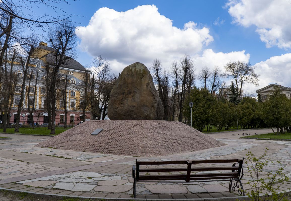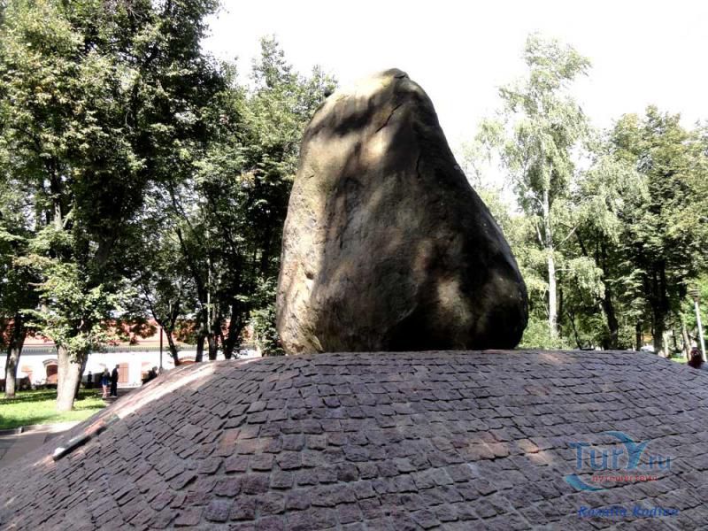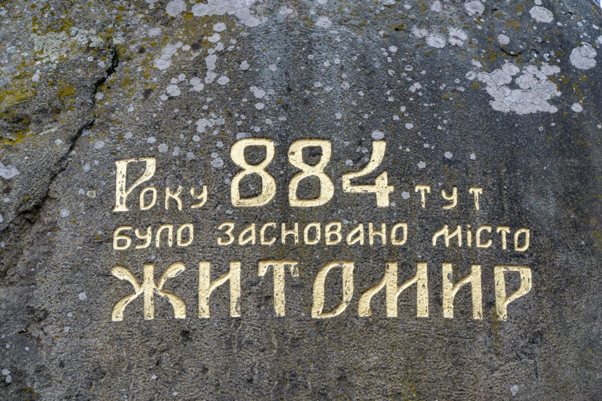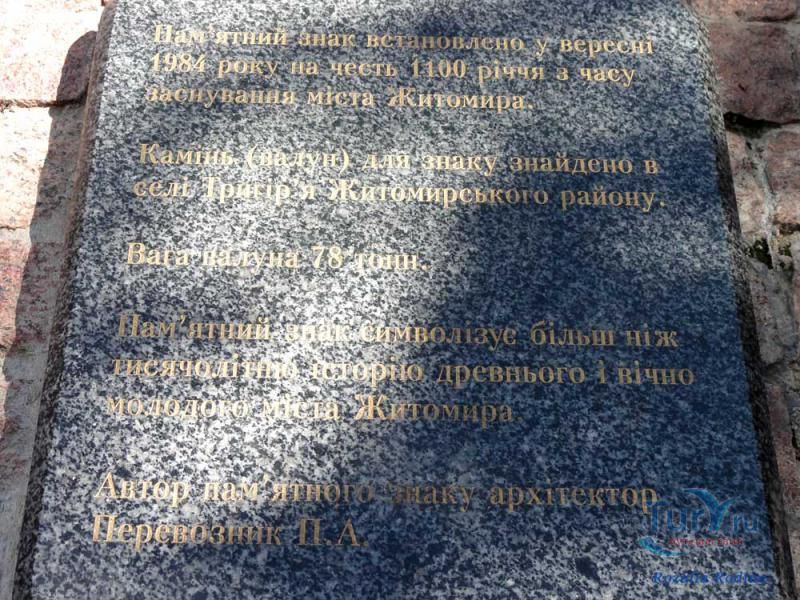 Монумент представляет собой огромный многотонный валун с надписью, которая гласит "Здесь в 884 году был основан город Житомир". Автор проекта памятного Знака - житомирский архитектор П.А. Перевозник.