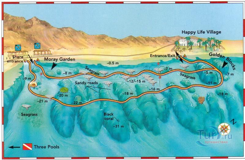 Глубина в районе дайв-сайта Golden Blocks составляет около 20 метров.
