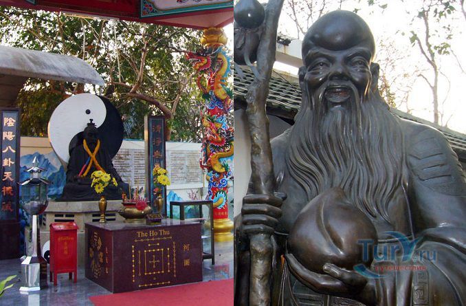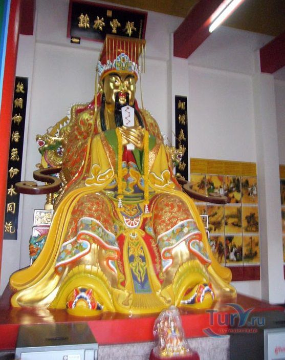 У подножия холма Большого Будды находится китайский храм богини милосердия, на территории которого имеется Большой колокол, статуи Конфуция, Лао-цзы и др., а также постройки в китайском стиле. Внутри святилища нельзя фотографировать, необходима соответствующая одежда, поведение не должно оскорблять чувства верующих. Зато в храмовый колокол можно постучать. Это разрешается каждому желающему и считается добрым знаком. В китайском храме гадают с выбрасыванием палочек. Это длинные одинаковые плоские деревянные палочки с номерами от 1 до 28 в круглой поставке. Поглядев вокруг, вы увидите, как гадают: сильно трясут ёмкость с палочками, пока одна из них не выпадет. Сверив ее номер с номером в таблице на стене можно узнать предсказание судьбы. Территория храма ухоженная, много статуй Лао-цзы с персиком и оленем, лошадь, львы. Стены разрисованы в стиле фэн шуй, Дракон и Феникс - основной Инь-Ян символ китайской космологии и мифологии. Дракон - символ мужского начала и изобилия, Феникс - иньское великолепие и женская красота. Вместе они символизирует плодотворный брак, благословляемый успехом, процветанием и детьми. У подножья горы есть маленький живописный парк со скамейками у пруда.