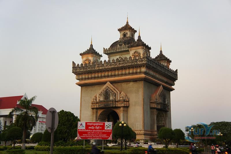 Триумфальная арка в центре Вьентьяна, украшенная государственными флагами и знаменами компартии с серпом и молотом. Смешение европейских элементов и восточного колорита создает удивительный вид.
