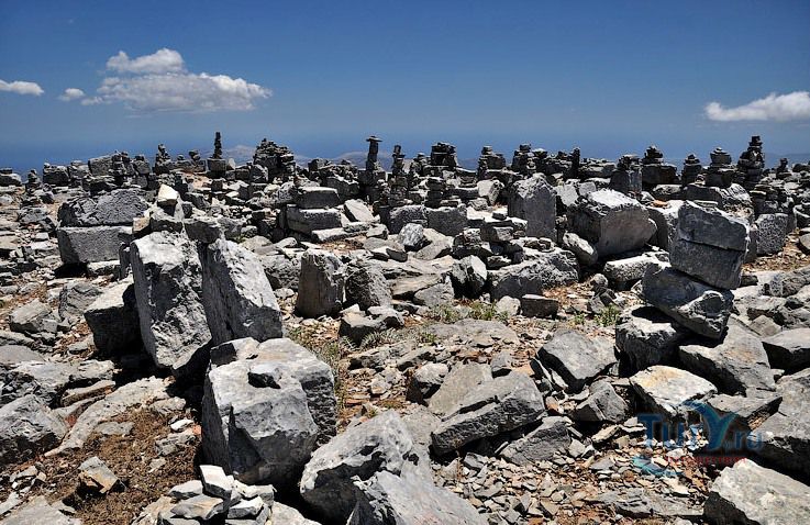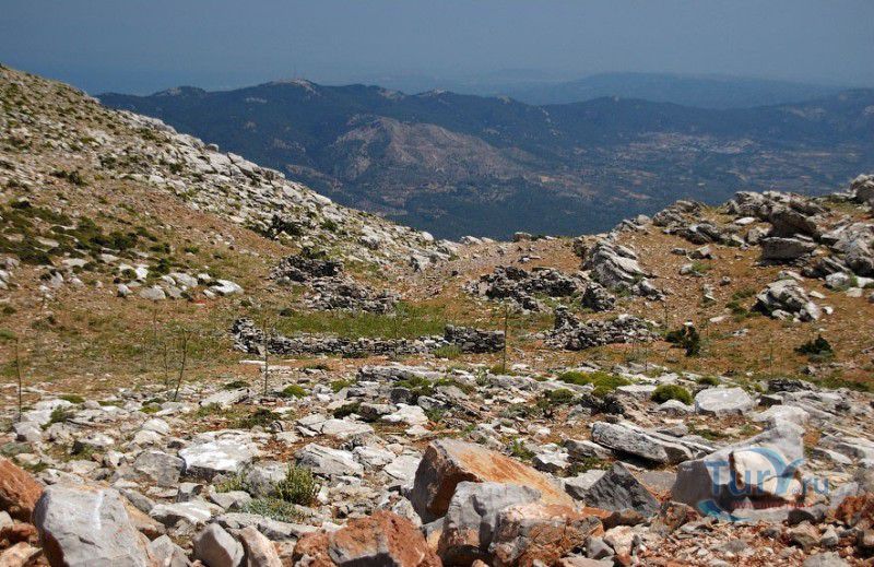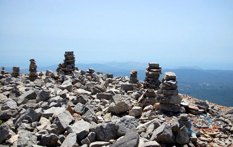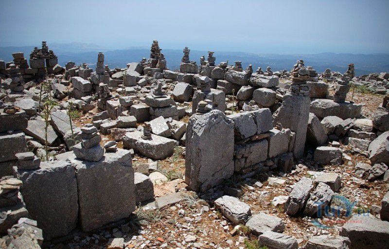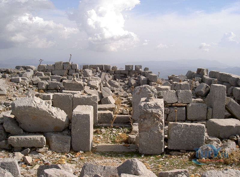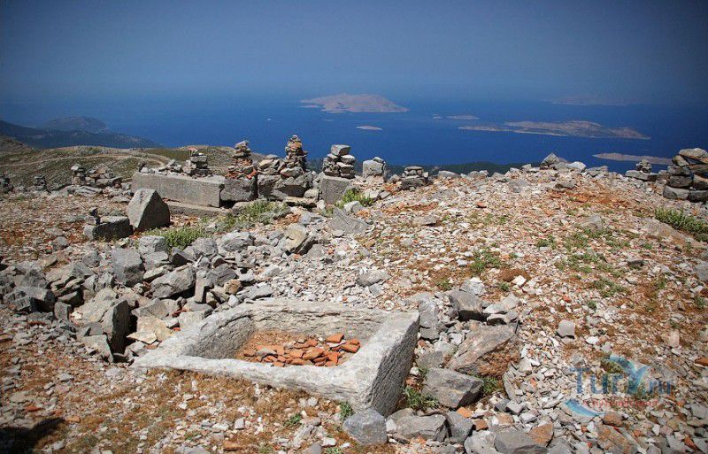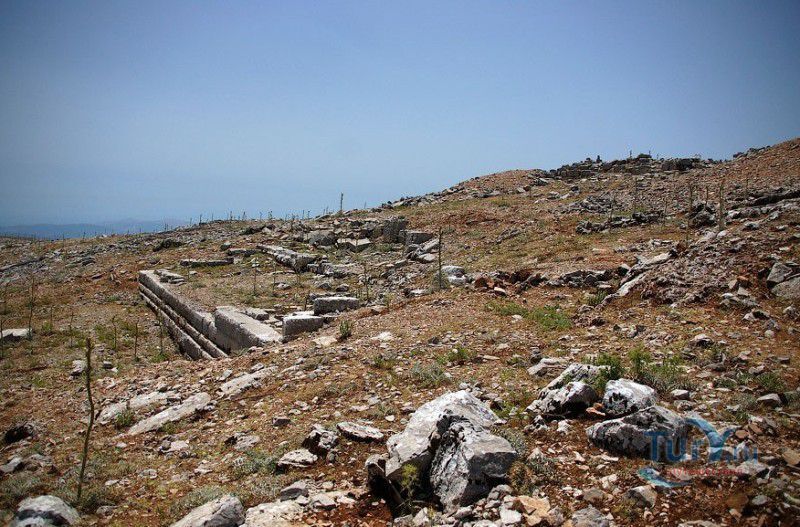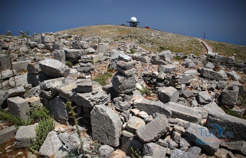 Развалины храма Зевса находятся на самой высокой горе острова Родос. Древние греки считали такие высоты пристанищем богов, точнее их верховного бога - Зевса, и возводили на вершинах храмы и алтари. Согласно мифу о Катрее и Главке, храм был построен критянином Алфеменом, сыном царя Крита Катрея. В легенде сказано, что у сына Миноса - Катрея было 4 детей: дочери Айропа, Климена и Апемосина и сын Алфемен. Однажды оракул предсказал Катрею, что он погибнет от руки одного из своих детей. Катрей спрятал предсказателя от людей, но Алфемен узнал тайну. И не желая быть виновником смерти отца, вместе с Апемосиной перехал на остров Родос (в Атабирию), в место, которое он позже называет Критиниа. Самую высокую гору называет Атабирион и строит там алтарь и храм, посвященный Зевсу Атабириону. По немногочисленным заметкам известно, что здесь стояли бронзовые фигуры быков (бык - одно из основных олицетворений Зевса), которые при приближении опасности начинали реветь.