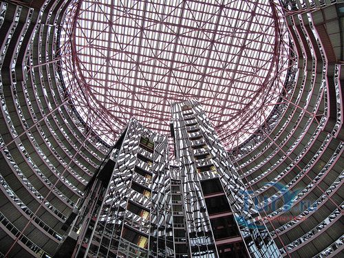 Первый этаж, он же единственный нестеклянный этаж, выполнен в темно-красных тонах, что серьезно контрастирует со стеклянно-алюминиевой шапкой верхних этажей. Не забудьте посетить лобби. отсюда можно осмотреть все 17 этажей центра, напоминающих отсюда разрезанный слоеный пирог.