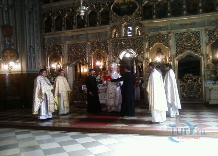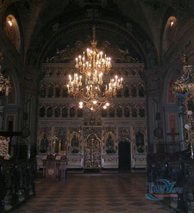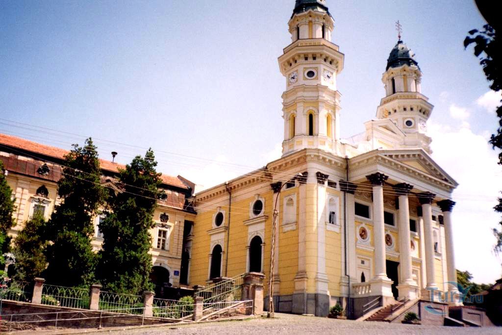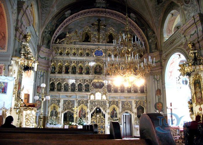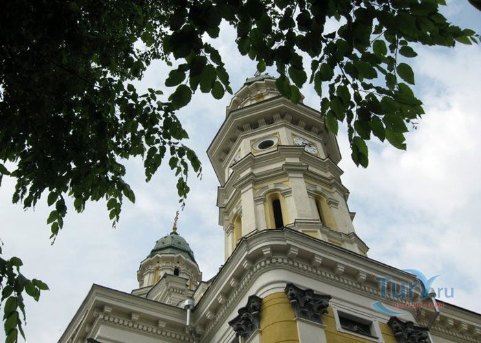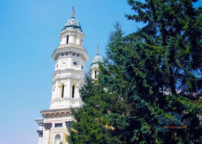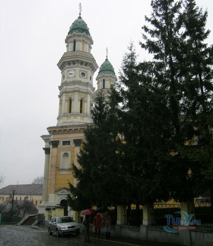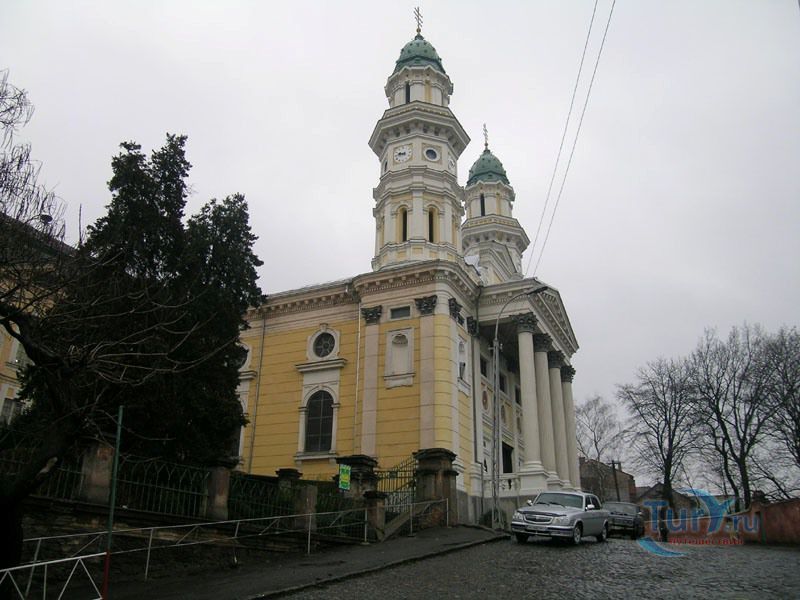 Кафедральный собор был основан, как римо-католический храм 16 июля 1640 года. Бывший владелец Ужгорода граф Ян Другет в 1644 году в период контрреформации выдал иезуитам дарственную грамоту обширной деятельности на Замковой горе. С поддержкой графа началось строительство коллегии-школы и костела. Завершила строительство уже вдова Другета - Анна Якушич в 1646 году. После изгнания иезуитов с территории Австрийской империи, императрица Мария-Терезия в 1775 году передала этот храм и резиденцию в собственность греко-католической епархии. Епископ А. Бачинкский перестроил его и построил здесь часовню Богородицы. С обеих боков центрального входа установлены таблички с надписями церковнославянским языком: "Крест - краса церквям, верным утверждение, нечистым смерть" и "Крест - хранитель мира, царям государство, ангелам слава". Под собором находится крипта - самое большое в Украине захоронение священников и мучеников. Среди служителей церкви в стенах собора покоятся мощи Теодора Ромжи, которого Папа римский Іоанн Второй во время визита в Украину признал блаженным, чем придал ему ранг святости. Чтобы увидеть эту величественную гробницу, нужно пройти таинственным подземельем.