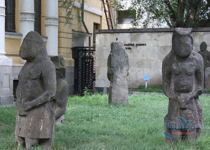 Коллекция древних каменных изваяний, или "каменных баб", как их называют в народе, несомненно, относится к числу наиболее ярких и своеобразных собраний Днепропетровского исторического музея. Поражает не только количество изваяний, но и их хронологическое и культурное разнообразие. Это одна из самых больших коллекций древней каменной пластики на Украине. В коллекции есть антропоморфные стелы эпохи энеолита (III тысячелетие до н.э.). Оригинальные скифские статуи VI - IV веков до н.э., средневековые тюркские половецкие статуи. Благодаря средневековым половецким статуям, именно их облику, своеобразным чертам все каменные статуи южноукраинских степей обязаны своим названием "бабы", (от тюркского "вава" - предок, дед). Существует легенда о происхождении "каменных баб". Жили когда-то на земле богатыри-великаны. Рассердились они на солнце, начали на него плевать. Разгневалось солнце и превратило великанов в камни. Сейчас коллекция "каменных баб" находится в Днепропетровском историческом музее.
