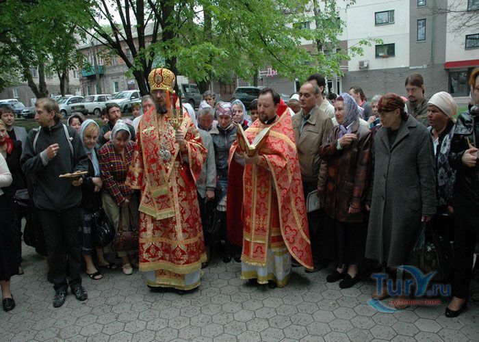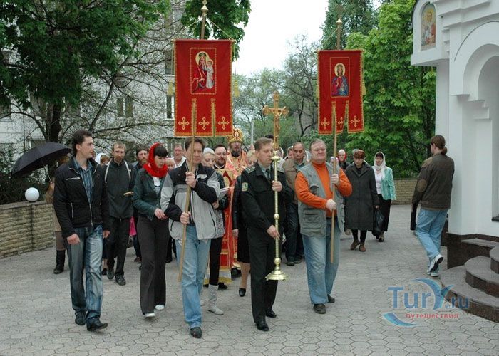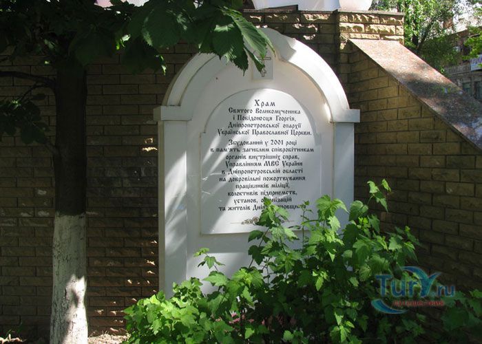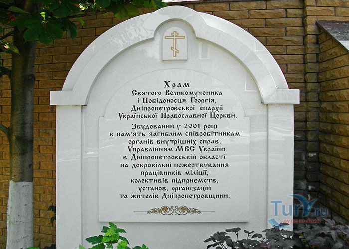 Храм Святого Великомученика Победоносца и Чудотворца Георгия находится в Бородиновском сквере города Днепропетровска, рядом с областным управлением внутренних дел. Церковь была построена в 2001 году. Святой Георгий Победоносец в православном мире считается покровителем воинства. Неслучайно его светлому имени храм воздвигли работники милиции, чьё призвание – беспощадно бороться со всем, что мешает нам жить по людским и Божьим законам. На стенах храма перед его алтарем – две мемориальные доски с 60-ю фамилиями рыцарей правопорядка павших при исполнении служебного долга. Без сомнения, самым ярким и ценным украшением Храма стала его роспись. Известные днепропетровские художники сумели объединить элементы реалистической традиции иконописи, идущие от Васнецова и Нестерова, с исконно украинским колоритом, присущим великолепным росписям в киевских соборах.