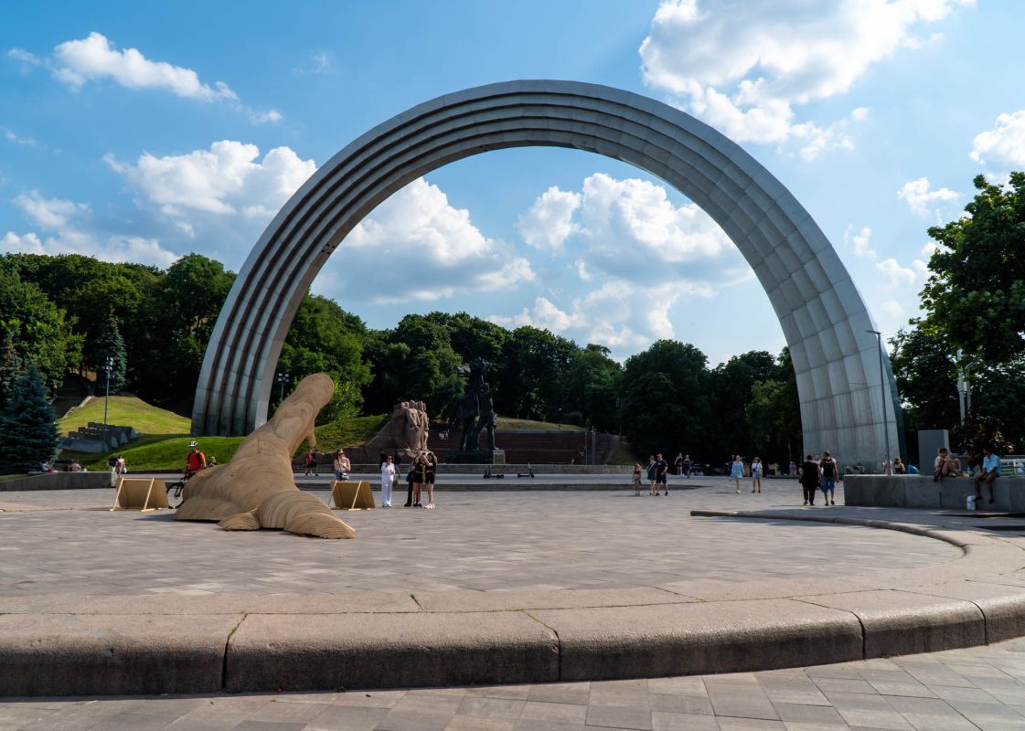 Арка Дружбы Народов расположена в центре Киева, в Хрещатом парке. Монумент, работа над которым велась четыре года, появился в 1982 г. в ходе подготовки к празднованию 1500-летия Киева, посвящен воссоединению Украины с Россией. Скульптурная композиция состоит из трёх элементов: самой арки в виде громадной радуги, бронзовой скульптуры двух трудящихся, держащих в руках советский орден Дружбы народов, и сцены Переяславской рады. В центре композиции - статуя Богдана Хмельницкого и боярина Василия Бутурлина, русского посла. В результате Переяславской рады был подписан исторический договор об объединении Украины с Россией. За монументом расположена смотровая площадка, с которой открываются великолепные виды на Днепр и Левый берег.