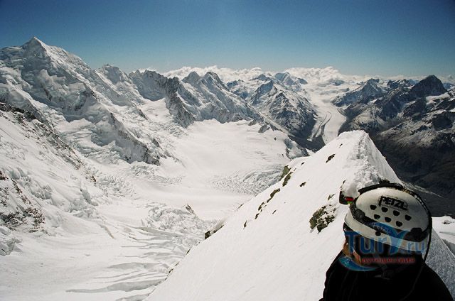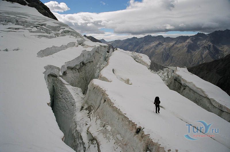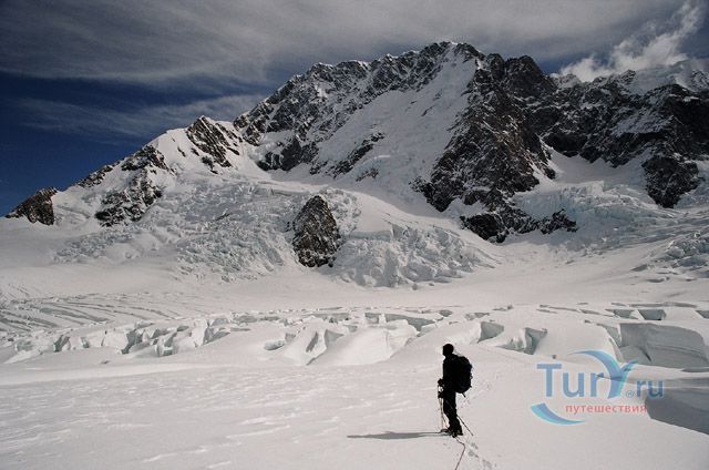 Южные Альпы образуют высокий горный барьер вдоль западного побережья острова Южный в Новой Зеландии. Самая высокая точка, гора Кука (3764 м), является самой высокой горой Новой Зеландии; всего 32 км. прибрежной полосы отделяют ее от Тихого океана. К востоку земля понижается медленнее и до берега, через равнины Кентербери, тянется примерно на 130 км. Западные ветры, дующие с Тасманского моря, насыщены влагой; и когда этот влажный воздух поднимается в горы, он приносит на хребет обильные снегопады, питающие ледники, из которых наиболее знамениты три: Тасманский, Фокса и Франца-Иосифа. Ледники на западной стороне гор короткие и крутые. Скатываясь замерзшими водопадами, тянущимися к густым субтропическим вечнозеленым дождевым лесам, они создают фантастическую картину. Близость льда и деревьев поразительна: воистину очень редко случается видеть столь контрастные природные зоны в таком тесном соседстве. Во всем остальном мире каждая из них водит собственную компанию и они не встречаются. На восточной стороне хребта характер ледников абсолютно иной: на большой высоте они крутые и обветренные, покрытые густой сетью трещин, затрудняющих их прохождение. Эти ледники опускаются до малых высот, а Тасманский ледник почти достигает центральной равнины.