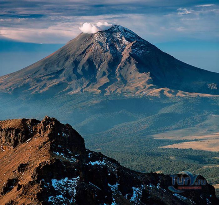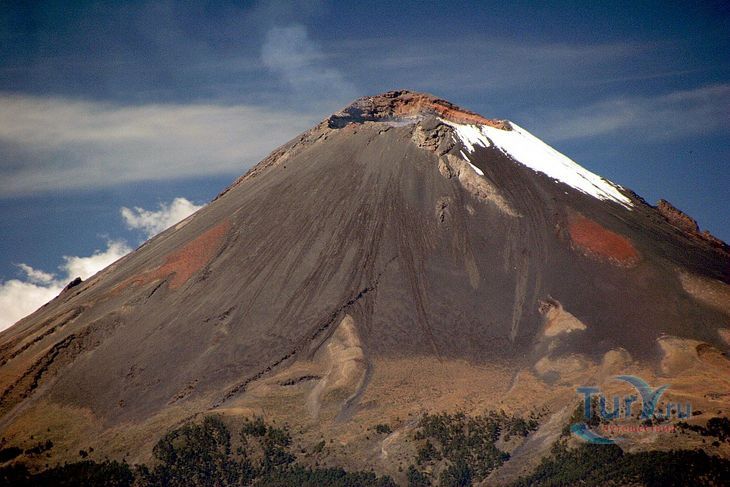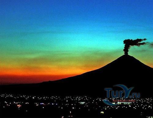 Впрочем, что еще делать вулкану, имя которого в переводе с индейского и означает «дымящая гора». Вершина Попокатепетля возносится на 5452 метра, вокруг кратера всегда лежит снег. С величественной горой связано немало легенд и обрядов. Попо и его соседка Истаксиуатль считались у ацтеков богами, дарующими дождь. Именно к ним обращались в случае засухи, поклонялись и приносили жертвы. Но когда-то Попокатепетль и Истаксиуатль были людьми. Истаксиуатль – дочь ацтекского императора полюбила привлекательного, сильного и смелого воина Попокатепетля. Юноша тоже был неравнодушен к знатной красавице. И все бы хорошо, но отца не устраивали эти отношения, он планировал отдать дочь замуж за знатного человека. Поэтому Попокатепетля отправили воевать в долину Оахака. Сомнений в том, что он там погибнет, у императора не было. Он сообщил своей дочери о смерти возлюбленного. От горя она умерла. Но воин вернулся домой невредимым. Узнав о случившемся, он взял тело девушки и ушел в горы. Где через некоторое время тоже умер от тоски. Но так велика была их скорбь и любовь, что даже боги сжалились и укрыли снежным одеялом каждое тело. Так девушка и воин стали горами. И Попокатепетль до сих пор мстит людям за смерть любимой, периодически извергая лаву и пепел. Заснеженную вершину Попо впервые покорили в 1827 году. Кратер вулкана эллиптической формы, диаметр его (в самом широком месте) равен 600 метрам, глубина в спокойном состоянии 170 метров. В конце XIX века к вершине горы проложили дорогу для промышленных нужд (велась разработка и добыча серы), а также ею пользовались туристы. Но в последние годы вулкан опять стал проявлять признаки активности, поэтому посещать его не рекомендуется.