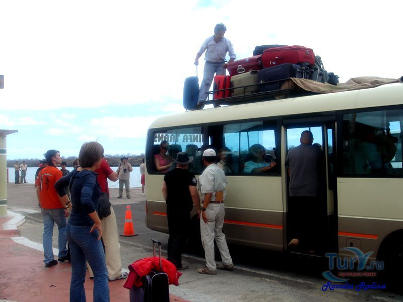 Всех пассажиров, которые прилетают на Галапагосы самолетом в главный аэропорт на о.Балтра, переправляют затем паромом через узкий пролив на остров Санта-Крус. Здесь на пристани багаж туристов перегружают на автобус и везут их по дороге через выжженные солцем долины и через покрытые буйной тропической растительностью возвышенности к самому большому городу Галапагосского архипелага Пуэрто-Айора.