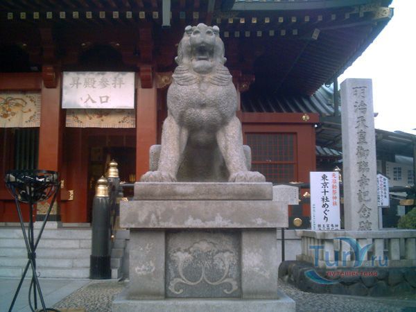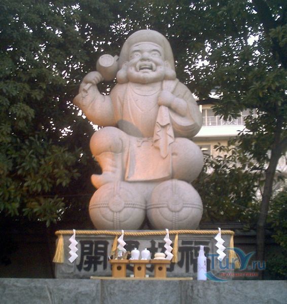 Возле входа установлены два изваяния лучников-хранителей в нарядной одежде. Сразу за входом слева находится большая каменная статуя Дайкоку, одного из семерых богов удачи.