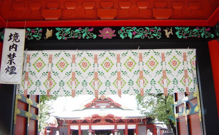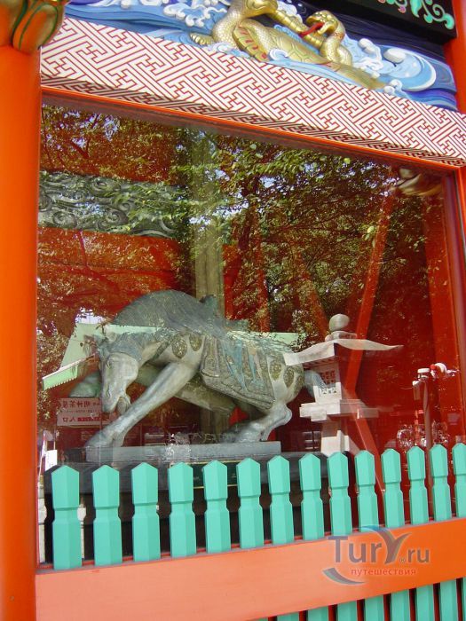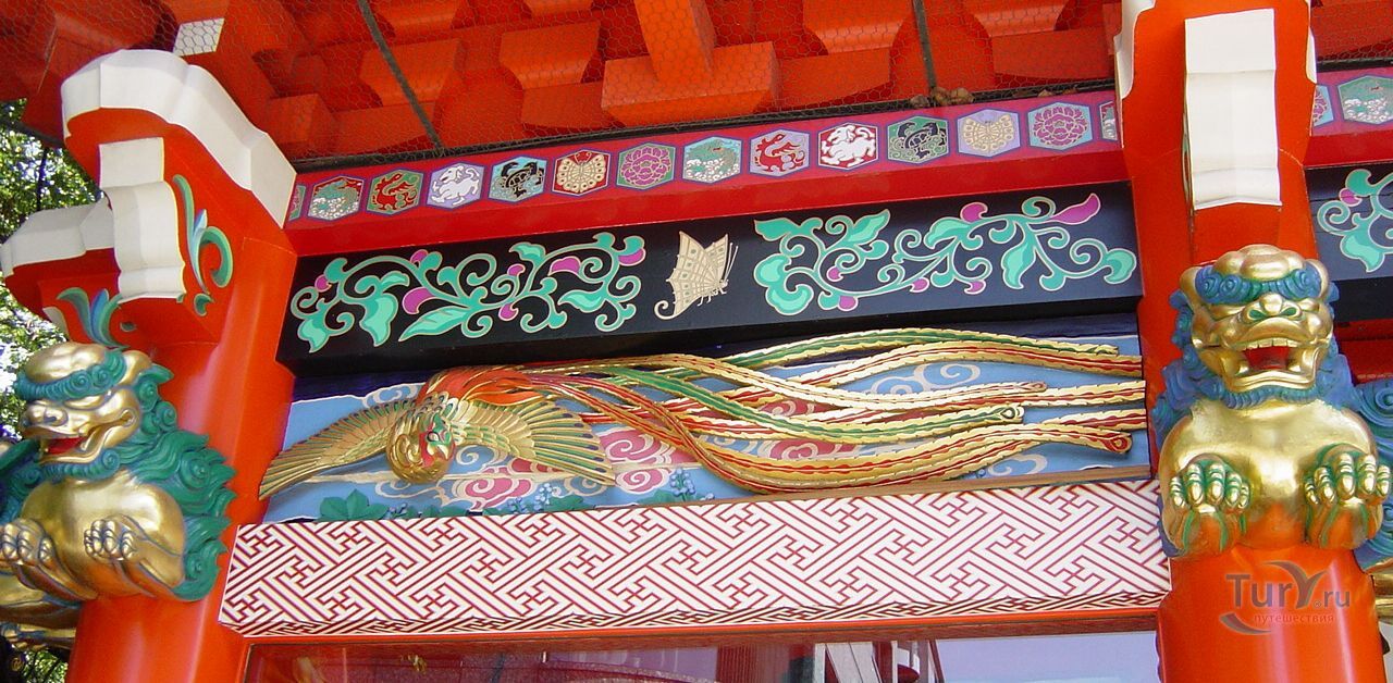 Ярко красные стены святилища и прекрасный интерьер в китайском стиле, украшенный лаком и золотом, оставляют глубокое впечатление. Ранним утром Вы можете увидеть священнослужителей синто, выполняющих свои обряды.