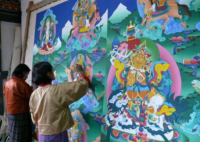 При посещении Художественной школа живописи в Тхимпху можно увидеть как обучают традиционному искусству живописи тханка (священных буддийских свитков). Искусство тханка представляет собой традиционную культовую живопись на свитках, распространенную в странах Центральной Азии. Процесс создания тханка длительный , сложный и очень трудоемкий, предполагает от художника не только терпения и выносливости, но и моральной чистоты и духовной силы. Материал, используемый для буддийской иконы – это льняная и хлопчатобумажная ткань, а иногда и шелк для особо важных изображений. . Древние мастера считали, что чем больше труда вложено в работу и чем больше потрачено времени и средств, тем ощутимее сила и влияние тханки. Раньше на изготовление тханка уходил целый год. Художники работали даже под увеличительным стеклом для того, чтобы добиться большой точности исполнения. Основной материал в тибетской живописи на свитках - ткань из хлопка, в редких случаях шелк. Создается тханка тщательно и неспешно. Холст, грунтованный раствором клея и мела, шлифуется драгоценным камнем, для того, чтобы добиться исключительной гладкости поверхности. Чистая и гладкая поверхность холста символизирует чистоту помыслов и ровное, спокойное состояние ума, которое нужно художнику, приступающему к работе над изображением просветленного лика. После различных подготовительных работ художник, выполнив специальные ритуалы очищения и медитации, наносит контуры рисунка в точном соответствии буддийским иконописным канонам и приступает к росписи полотна натуральными минеральными красками. Далее икона вшивается в парчовое обрамление с шелковым покрывалом и, наконец, проводится обряд освящения тханка, который проводит опытный Лама. Жанру тханка свыше 1400 лет и сформировался он сначала из украшений, которые монахи вешали на стены во время чтения мантр. Тханка - тибетская икона, перед ней монахи молятся, медитируют и совершают религиозные обряды. Свитки тханка выполняли для кочевников роль передвижных храмов, т.к. были боле удобны для перевозки и хранения, чем статуи богов. Тханка всегда можно было повесить не только на стене, но даже на ветке дерева в походных условиях. Самая маленькая тханка размером с ладонь. Самая большая - несколько сотен квадратных метров, и во время праздничных богослужений она разворачивается на склоне холма. "Тханка" - тибетское слово, которое состоит из двух смысловых частей. "Тхан" по-тибетски означает "простор, пространство". "Ка" может быть переведено как "заполнение пространства". Значит, хтанка - это наполнение пространства сутью. Благодаря бережному отношению монахов- художников традиция живописи хтанка сохранилась на протяжении веков и дошла и до наших дней. Художников, пишущих тханка называют "ладжиба", или "мастер, пишущий богов". Мастера живописи тханка передают секреты своего искусства из поколения в поколения, от мастера к ученику. Заказ на создание тханка может быть как от мирянина, так и от руководителя монастыря. Они говорят художнику, какой персонаж их обширного буддийского пантеона должен быть изображен. Этих указаний художник строго придерживается, поскольку мастеру было очень важно соблюдать каноны, в которых строго установлено положение не только фигур, но и выражения лиц и жесты. Особое очарование тханка придают ун