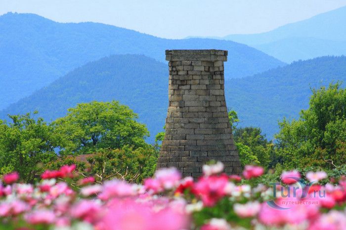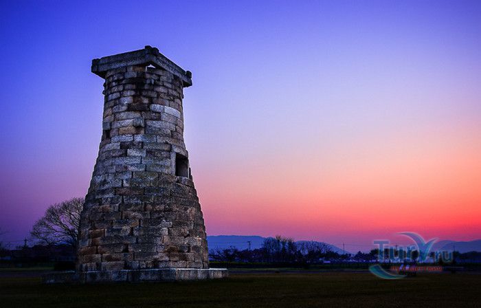 Обсерватория Чхомсондэ - одна из старейших, сохранившихся до наших дней, обсерваторий в Восточной Азии, расположена в Южной Корее, на территории Национального парка Кёнджу. Чхомсондэ в переводе с корейского означает "башня для наблюдения за звёздами", построена в 647 году по указу королевы Сондок недалеко от города Кёнджу - столицы древнего государства Силла. Обсерватория имеет цилиндрическую форму, высота башни - 9,4 метра, ширина в основании - 5,7 метра. Для строительства были использованы 362 гранитных блока (по количеству дней лунного года), уложенных друг на друга в 27 слоёв. При кладке не использовалось никакого связывающего раствора, конструкция держится за счёт своего веса и точно подогнанных друг к другу каменных глыб. Сужающаяся кверху башня заканчивается квадратной площадкой, ориентированной строго по сторонам света. Очевидно, эта площадка служила для установки астрономических приборов, с помощью которых составляли прогноз о предстоящих изменениях погоды, затмениях солнца, направлении ветра, определяли координаты небесных светил. Посередине башни, с южной стороны, находится смотровое окно, служившее для освещения и входа внутрь сооружения. Внутренне пространство до нижнего края окна, расположенного на 12 уровне каменной кладки, засыпано щебнем и грунтом, верхняя часть башни - полая. От входного отверстия на "крышу" обсерватории (ещё 12 уровней кладки) вели каменные ступени, по которым астрономы поднимались на верхнюю площадку. Есть предположения, что само здание башни использовалось в качестве гномона - древнего астрономического инструмента, позволяющего по отбрасываемой им полуденной тени определять высоту и положение Солнца. Форма сооружения, по предположению учёных, отождествлялась с древней теорией мироздания и символизировала землю (квадратные основание и верхняя площадка) и небо (округлые формы башни), а число 12 - количество месяцев в году. В 1962 году обсерватория Чхомсондэ как объект, имеющий большую историческую и архитектурную ценность, была признана Национальным сокровищем Южной Кореи.