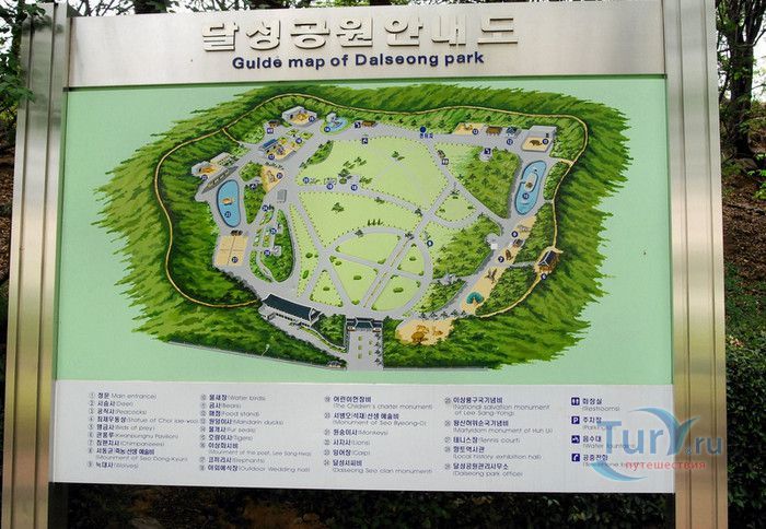 Парк Dalseong расположен в самом центре южнокорейского города Тэгу, занимает территорию площадью 129000 квадратных метров. В наши дни - это одно из самых популярных мест отдыха жителей и гостей города, а в 261 году, в эпоху Троецарствия, на этом месте было возведено одно из старейших земляных укреплений в Корее - крепость Dalgubeol. Во время китайско-японской войны в 1894-1895 годах на территории будущего парка располагалась японская военная база. Парк был создан в 1905 году, во время правления короля Кочжона из династии Чосон, а с 1965 года парк Dalseong стал общественным городским парком и местом жителей Тэгу. Ухоженные аллеи, зелёные лужайки и газоны, которые горожане используют для прогулок и семейных пикников, небольшой зоопарк, краеведческий музей и исторические достопримечательности - так выглядит парк сегодня. Особенно красив парк весной, во время цветения сакуры, магнолий и тюльпанов. Одна из достопримечательностей парка - павильон Gwanpungnu, служивший парадными воротами, через которые правители из династии Чосон въезжали в центр города. В парке установлены памятники историческим личностям и деятелям культуры, которые внесли большой вклад в историю Тэгу. Экспозиция краеведческого музея знакомит посетителей с историей местности с доисторических времён до возведения крепости Dalgubeol, с эпохой Троецарствия, периодом японской оккупации, этапами правления династии Чосон и настоящим города. В 1970 году в парке был открыт небольшой зоопарк. Его обитателями стали слоны, бенгальские тигры, львы, леопарды, медведи, обезьяны, волки, лисы, ламы, зебры, олени, верблюды, кролики, павлины, хищные и водоплавающие птицы. Особой популярностью у детворы и их родителей пользуется общение со звериными детёнышами и процесс кормления животных, в котором посетители также могут принять участие - угостить капустой кролика, пучком травы - слона или оленёнка. Подкармливать животных "несанкционированной" едой строго запрещено. В парке устраиваются культурные и развлекательные мероприятия, проходят концерты и выступления фольклорных коллективов, есть кафе, закусочные и сувенирные магазинчики.