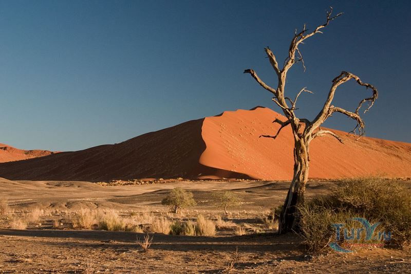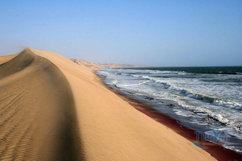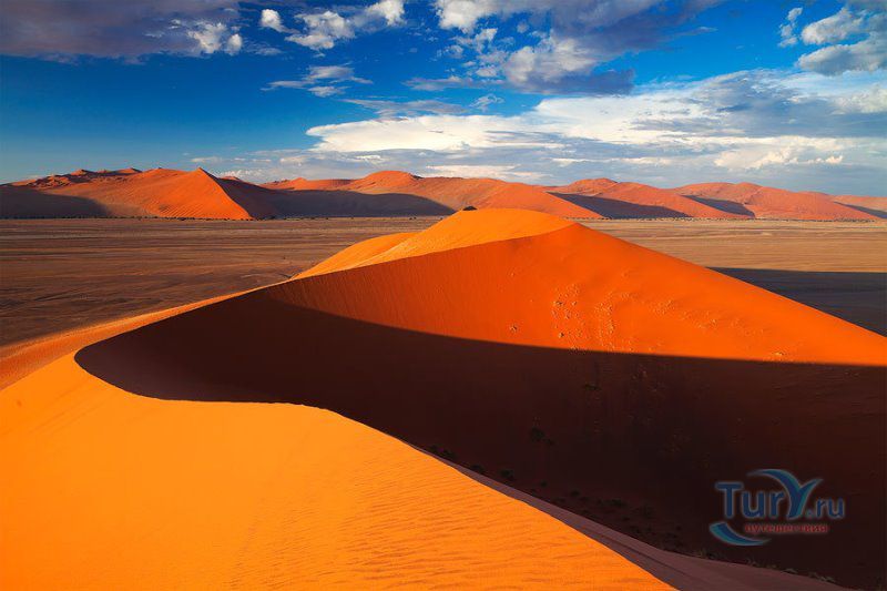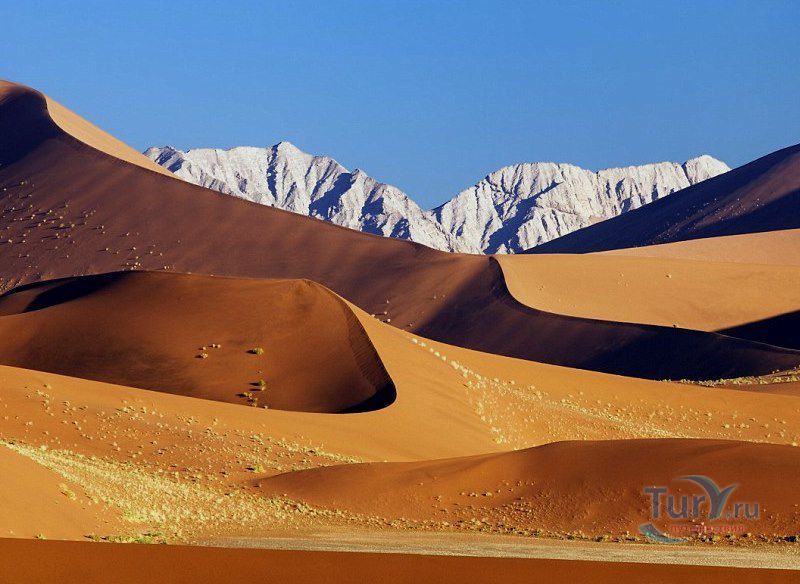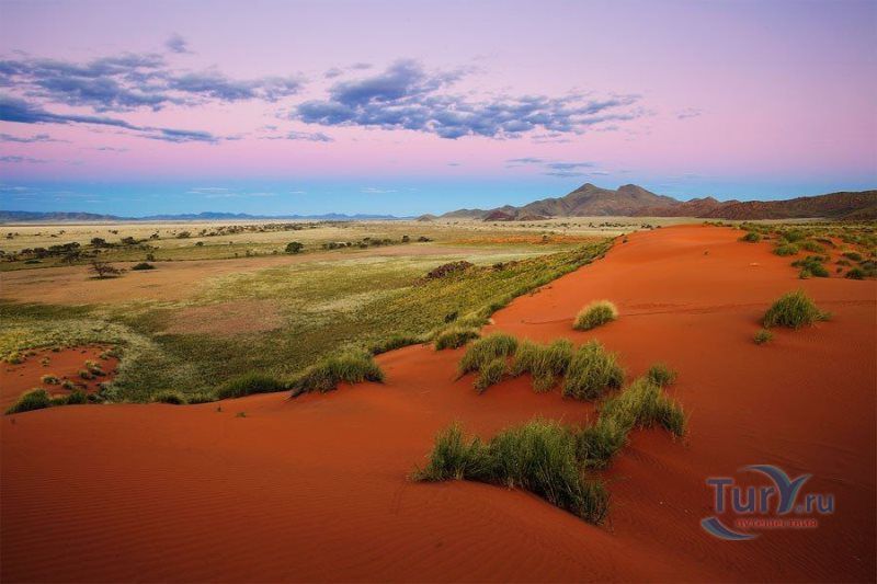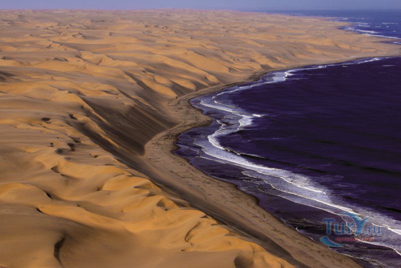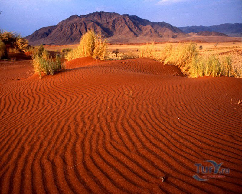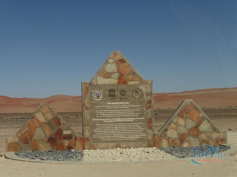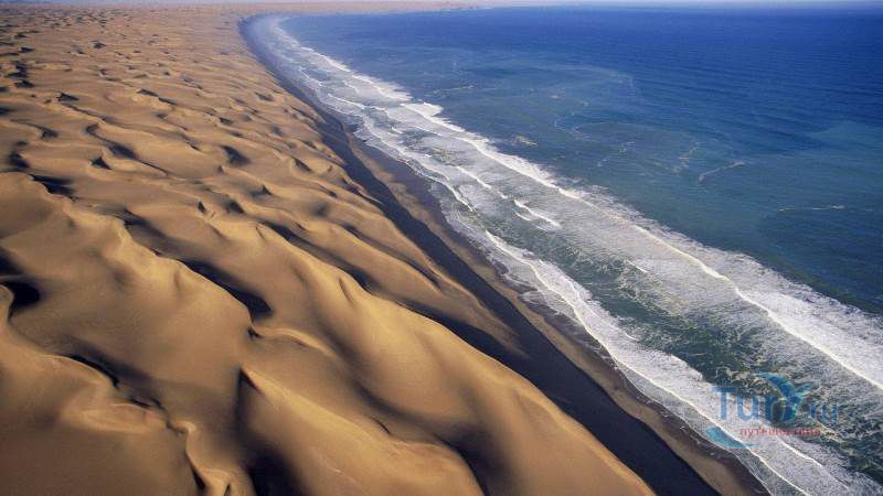 Пустыня Намиб представляет собой национальный парк, который расположен в юго-западной части Африки и занимает площадь более 100 тысяч кв.км. Название пустыни происходит из языка коренной народности нама и означает "место, где ничего нет". Считается, что Пустыня Намиб является самой древней пустыней в мире, она существует на протяжении 80 миллионов лет и по ней ещё ходили динозавры. Пустыня очень сухая, практически необитаемая. В год выпадает лишь 10-13 мм осадков. Бывают годы, когда дождей не бывает совсем. Но, вследствие особенностей климата, утром выпадает обильная роса. Для некоторых видов растений и животных роса наиболее важный источник влаги, чем осадки. Исключение составляют только несколько прибрежных городов. В южной части пустыни, недалеко от побережья, на поверхности находится песок жёлто-серого цвета, а песок кирпично-красного цвета находится на внутренней территории пустыни. С северо-запада на юго-восток параллельно побережью тянется гряда песчаных дюн. Некоторые дюны имеют длину 10-20 км и высоту до 240 метров. Здесь расположена самая высокая дюна в мире, которая имеет высоту 383 метра. В недрах пустыни находятся залежи урановых и вольфрамовых руд, а также алмазов. Эти дюны вдохновляют фотографов и художников со всего мира. Самое лучшее время для посещения пустыни - на восходе солнца или на закате, когда цвета самые насыщенные. Пустыня Намиб привлекает морских птиц, тюленей, а также пингвинов, которые любят гнездиться на берегах пустыни и на прибрежных островах, несмотря на африканскую жару. Впадины и дюны внутренней части Намиб являются убежищем для антилоп, зебр, страусов. В северной части пустыни, особенно в долинах рек, которые текут с внутреннего плато в Атлантический океан, встречаются слоны, львы, носороги, гиены, шакалы. Здесь много пресмыкающихся, пауков, комаров, муравьёв, жуков. Прибрежная зона с островами заселена большим количеством морских птиц - фламинго, бакланами, пеликанами и другими видами. Пустыня Намиб поражает разнообразием своих ландшафтов. Эти многочисленные каньоны сухих рек, выветренные скалы, обширные щербистые пустоши и непрерывно перемещающиеся огромные дюны перемежаются крохотными оазисами. Пустыня Намиб является заповедной и рекреационной зоной.