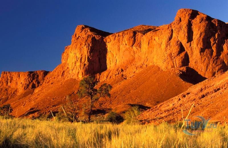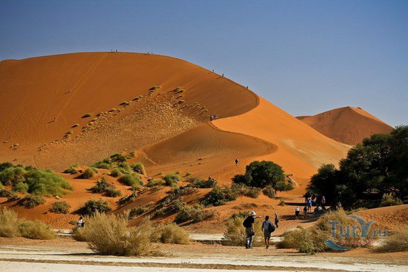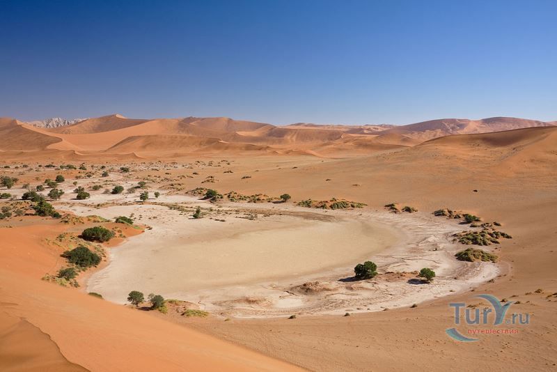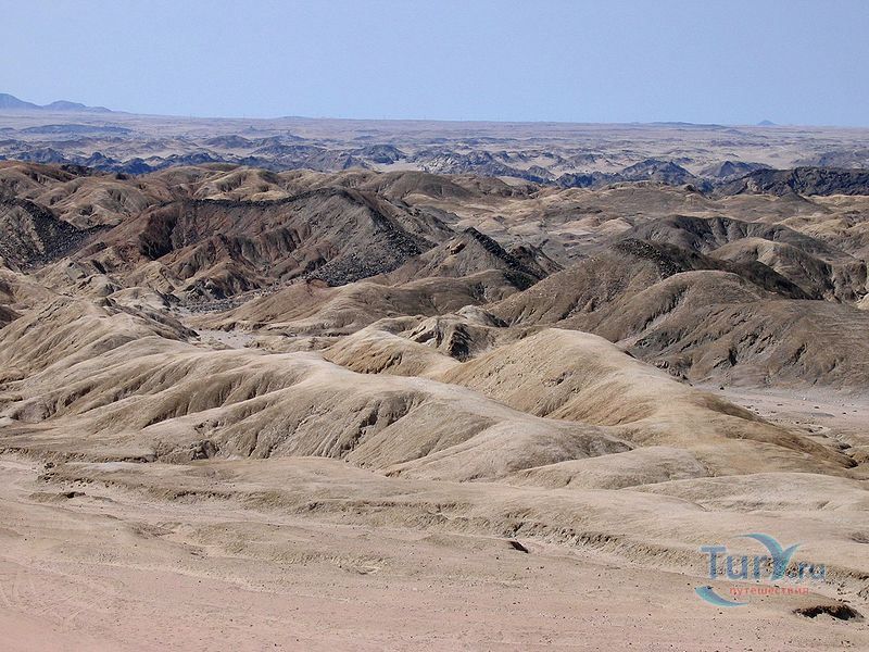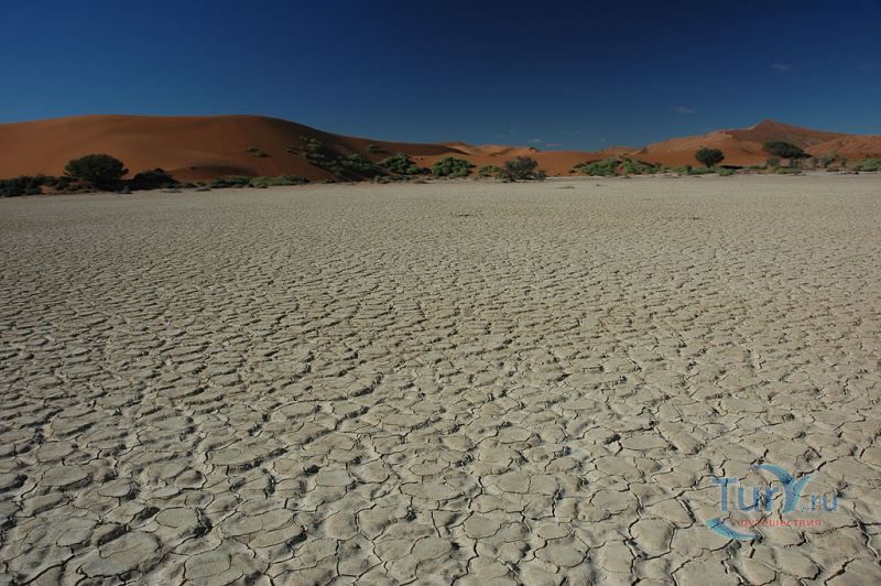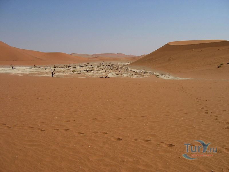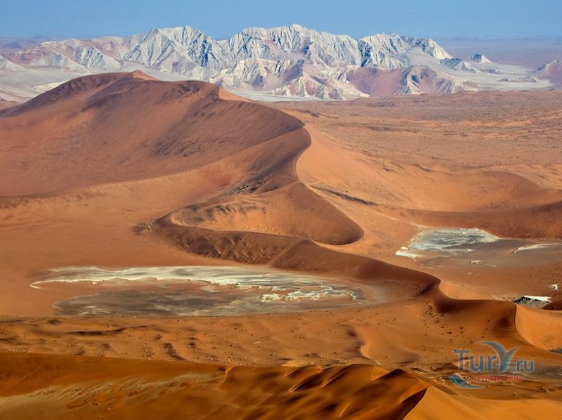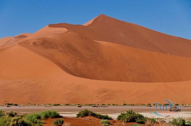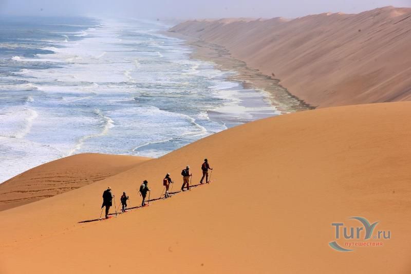 Пустыня Намиб представляет собой национальный парк, который расположен в юго-западной части Африки и занимает площадь более 100 тысяч кв.км. Название пустыни происходит из языка коренной народности нама и означает "место, где ничего нет". Считается, что Пустыня Намиб является самой древней пустыней в мире, она существует на протяжении 80 миллионов лет и по ней ещё ходили динозавры. Пустыня очень сухая, практически необитаемая. В год выпадает лишь 10-13 мм осадков. Бывают годы, когда дождей не бывает совсем. Но, вследствие особенностей климата, утром выпадает обильная роса. Для некоторых видов растений и животных роса наиболее важный источник влаги, чем осадки. Исключение составляют только несколько прибрежных городов. В южной части пустыни, недалеко от побережья, на поверхности находится песок жёлто-серого цвета, а песок кирпично-красного цвета находится на внутренней территории пустыни. С северо-запада на юго-восток параллельно побережью тянется гряда песчаных дюн. Некоторые дюны имеют длину 10-20 км и высоту до 240 метров. Здесь расположена самая высокая дюна в мире, которая имеет высоту 383 метра. В недрах пустыни находятся залежи урановых и вольфрамовых руд, а также алмазов. Эти дюны вдохновляют фотографов и художников со всего мира. Самое лучшее время для посещения пустыни - на восходе солнца или на закате, когда цвета самые насыщенные. Пустыня Намиб привлекает морских птиц, тюленей, а также пингвинов, которые любят гнездиться на берегах пустыни и на прибрежных островах, несмотря на африканскую жару. Впадины и дюны внутренней части Намиб являются убежищем для антилоп, зебр, страусов. В северной части пустыни, особенно в долинах рек, которые текут с внутреннего плато в Атлантический океан, встречаются слоны, львы, носороги, гиены, шакалы. Здесь много пресмыкающихся, пауков, комаров, муравьёв, жуков. Прибрежная зона с островами заселена большим количеством морских птиц - фламинго, бакланами, пеликанами и другими видами. Пустыня Намиб поражает разнообразием своих ландшафтов. Эти многочисленные каньоны сухих рек, выветренные скалы, обширные щербистые пустоши и непрерывно перемещающиеся огромные дюны перемежаются крохотными оазисами. Пустыня Намиб является заповедной и рекреационной зоной.