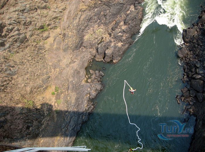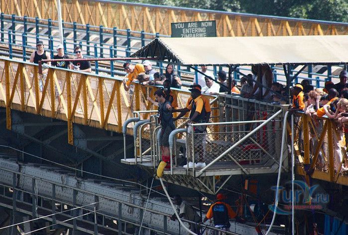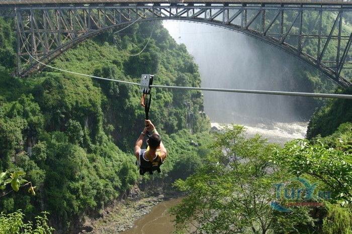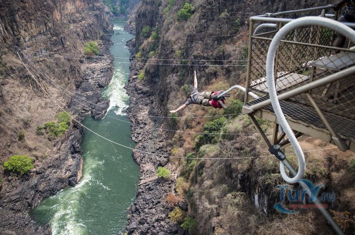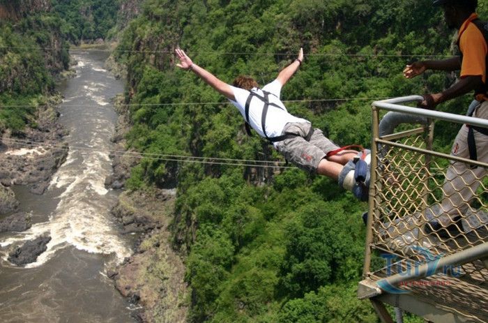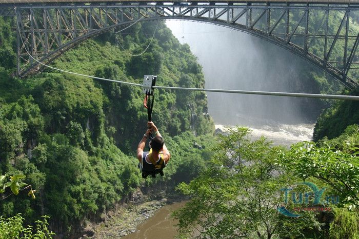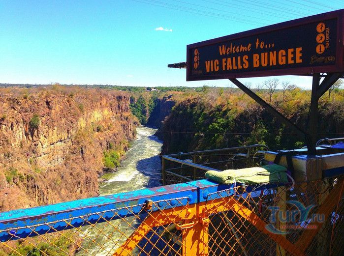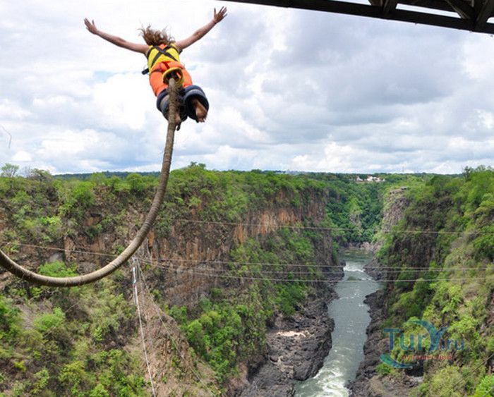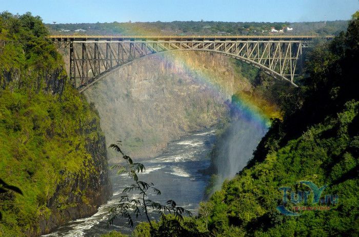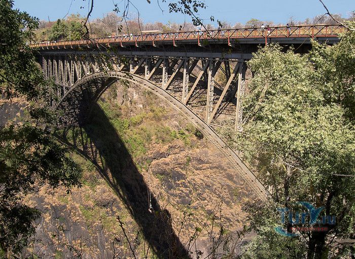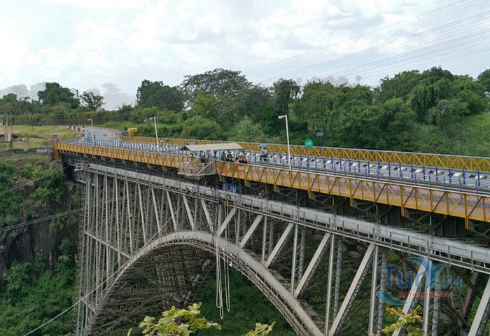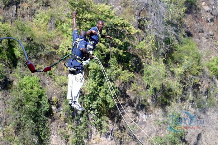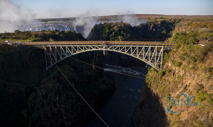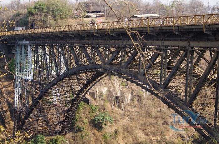Железнодорожный мост у водопада Виктория на реке Замбези, соединяющий Замбию и Зимбабве, расположен чуть ниже водопада Виктория. Мост сам по себе является популярной достопримечательностью, которую посещают тысячи туристов, с него открывается великолепный вид на водопад Виктория и реку Замбези. Кроме того, мост привлекает любителей острых ощущений возможностью совершить головокружительный прыжок банджи с высоты 111 метров, зависнув буквально в нескольких метрах от порогов на реке Замбези. Интересно, что банджи-джампинг зародился именно на просторах Африки - у некоторых африканских племён существует старинный ритуал, когда мужчины взбираются на 30-метровую вышку, обвязывают ноги лианами и прыгают вниз. Особенность этого прыжка в том, что голова должна коснуться земли, а смысл ритуала - уберечь племя от неурожая. После того, как новозеландец Эй Джей Хаккетт впервые прыгнул вниз головой с привязанным к ногам эластичным канатом, банджи-джампинг стал массовым экстремальным увлечением во всем мире. Многие любители пощекотать нервы утверждают, что прыжок с моста у водопада Виктория - лучший прыжок банджи в мире. Кроме того, есть возможность прокатиться над ущельем по 135-метровому канату, натянутому на высоте 75 метров, или испытать "качели моста", спрыгнув с разбега прямо в пропасть и на протяжении 50 метров пребывать в свободном полёте. Естественно, прыжок совершается с надежно закреплённым за спиной эластичным канатом, прыгать можно как одному, так и в тандеме. По желанию, можно заказать съёмку своего полёта над бездной.