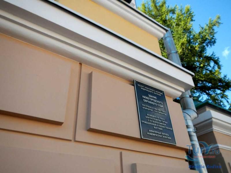 Здание Нижегородского Окружного суда находится на знаменитой пешеходной улице Нижнего Новгорода - Большой Покровской №17. Этот дом был построен в конце девятнадцатого века и имеет уникальную историю. Первоначально на этом месте располагался дом нижегородского генерал-губернатора Михаила Петровича Бутурлина. Гостем губернатора в этом доме в сентябре 1833 года стал А.С. Пушкин, которого приняли за ревизора. История, пересказанная Пушкиным Гоголю и послужила в последствии основой написанной им пьесы «Ревизор», которая пользовалась большой популярностью и вошла в историю мировой литературы. После переезда резиденции губернатора в Кремль присмотр за зданием постепенно сошёл на нет и здание стало приходить в упадок.